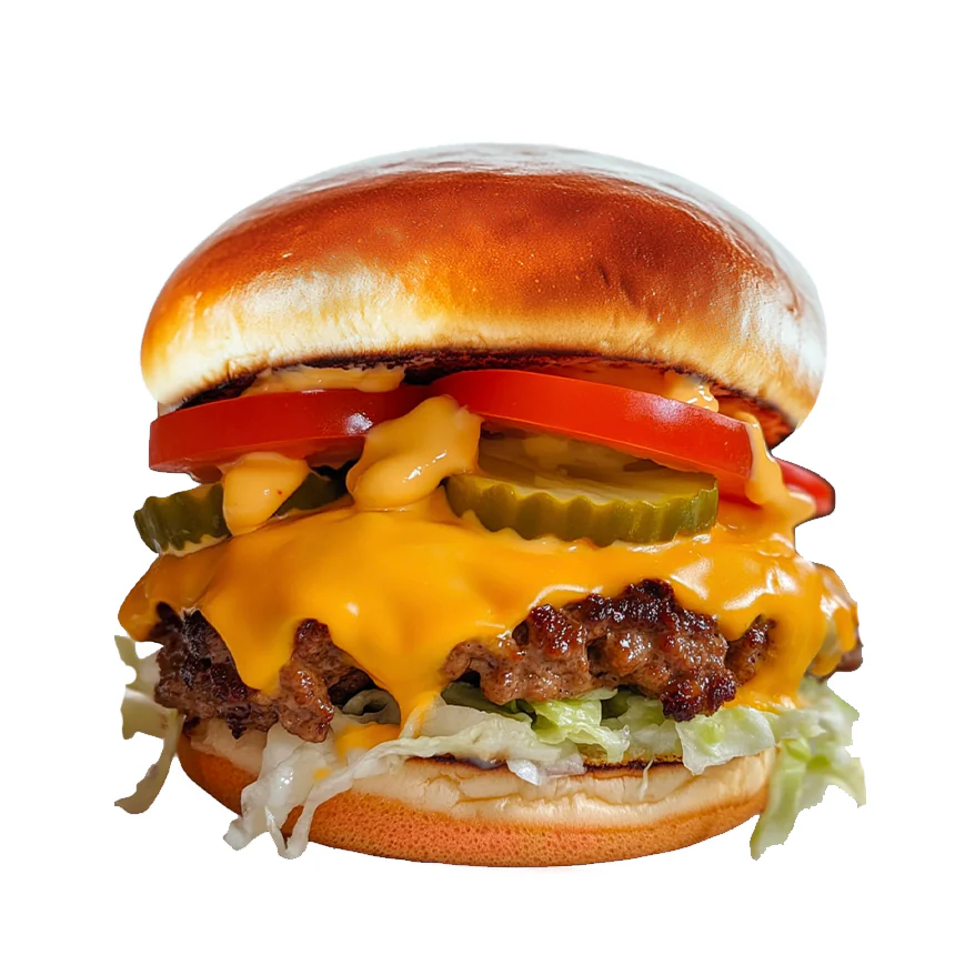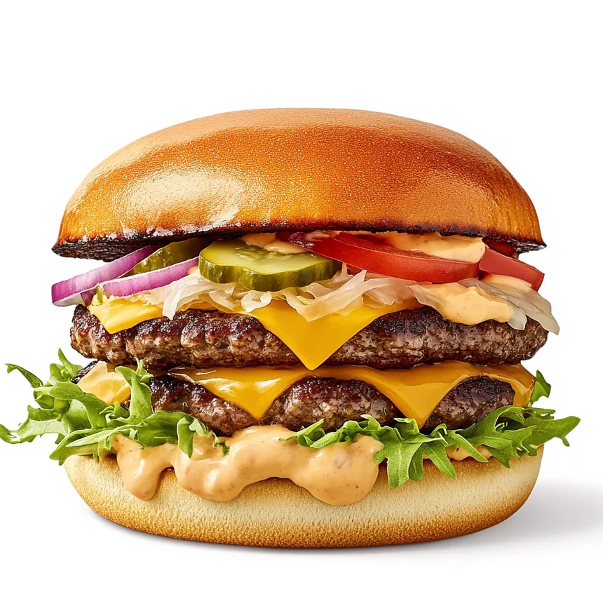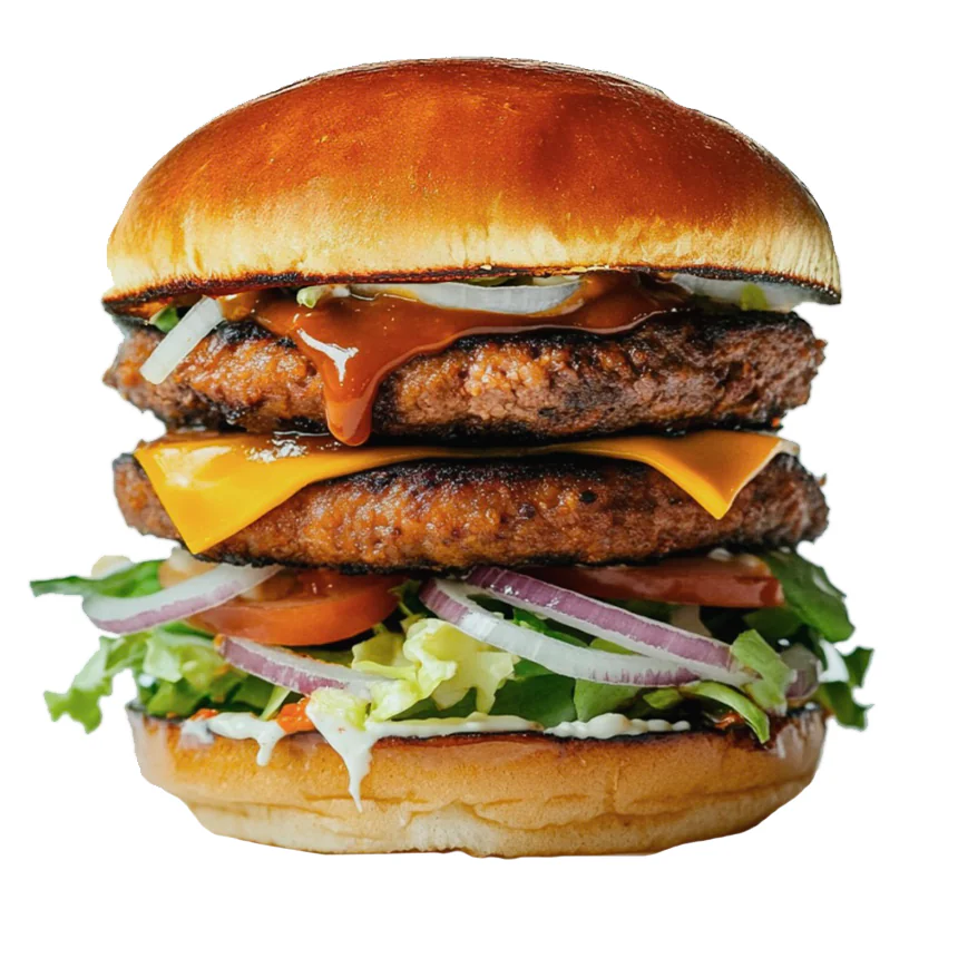 Две котлеты из говядины, сыр Чеддер, лук, листья салата, пикантный соус