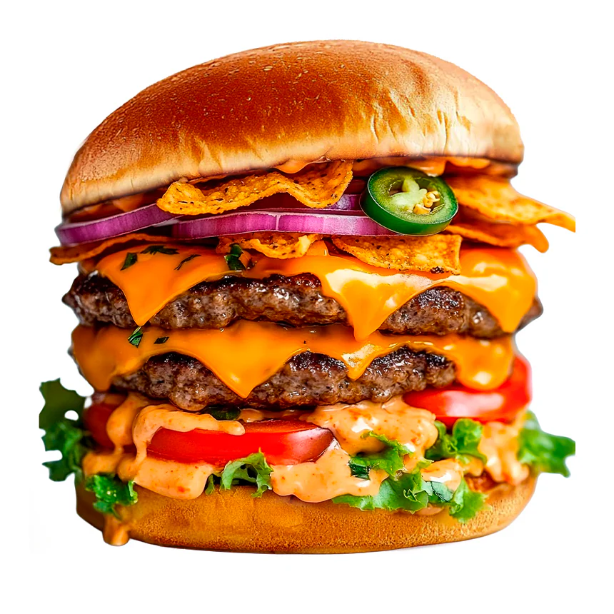 Две котлеты из говядины, сыр Чеддер(в растопленном виде), чипсы Начос, корейская морковь, помидор, перец халапеньо, лук красный, соус мексиканский, соус сырный