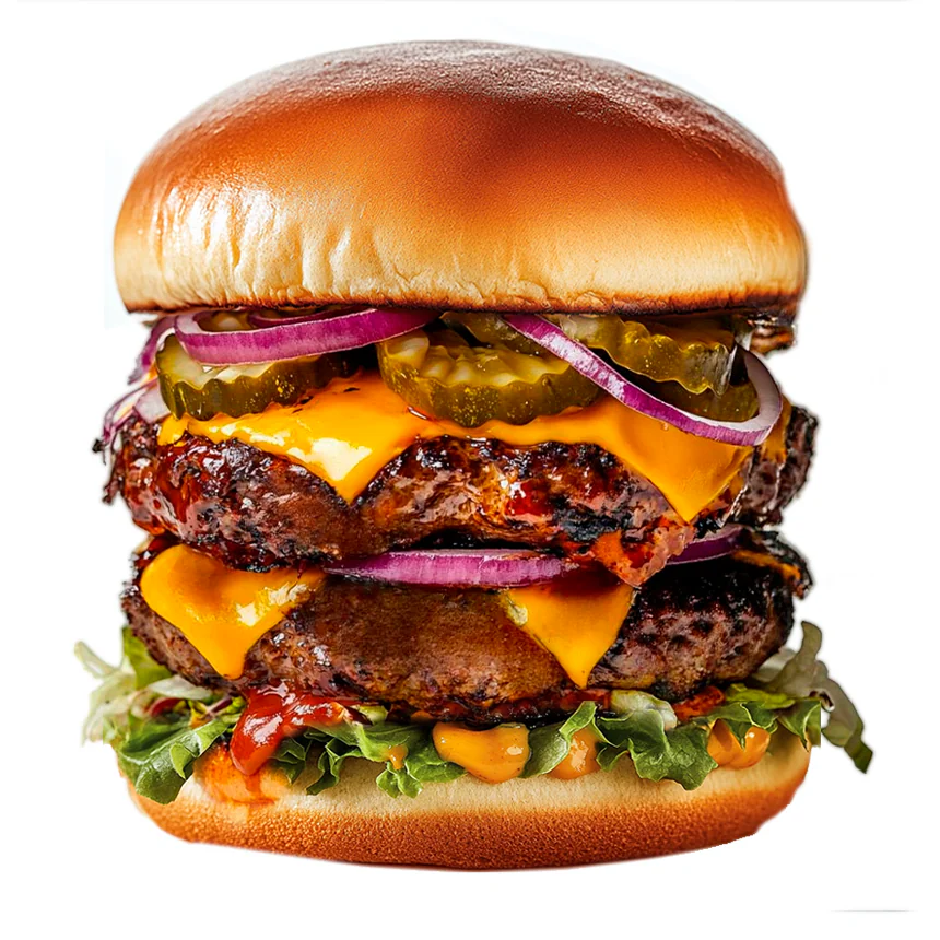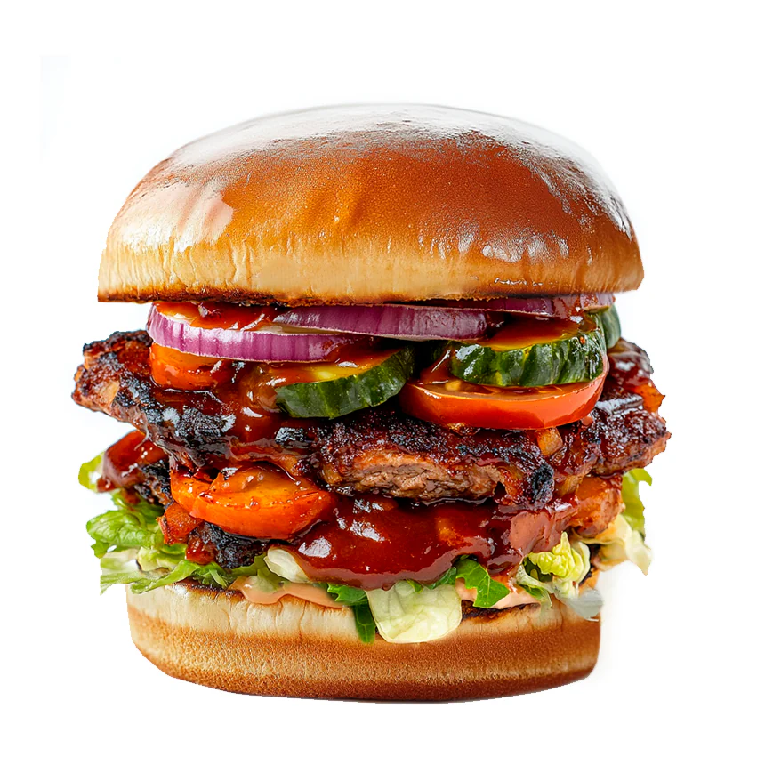 Две котлеты из говядины, сыр Чеддер(в растопленном виде), овощи на мангале с добавлением молодой зелени (петрушка, укроп, зелены лук), айсберг, маринованные огурцы, красный лук, фирменный соус, соус BBQ