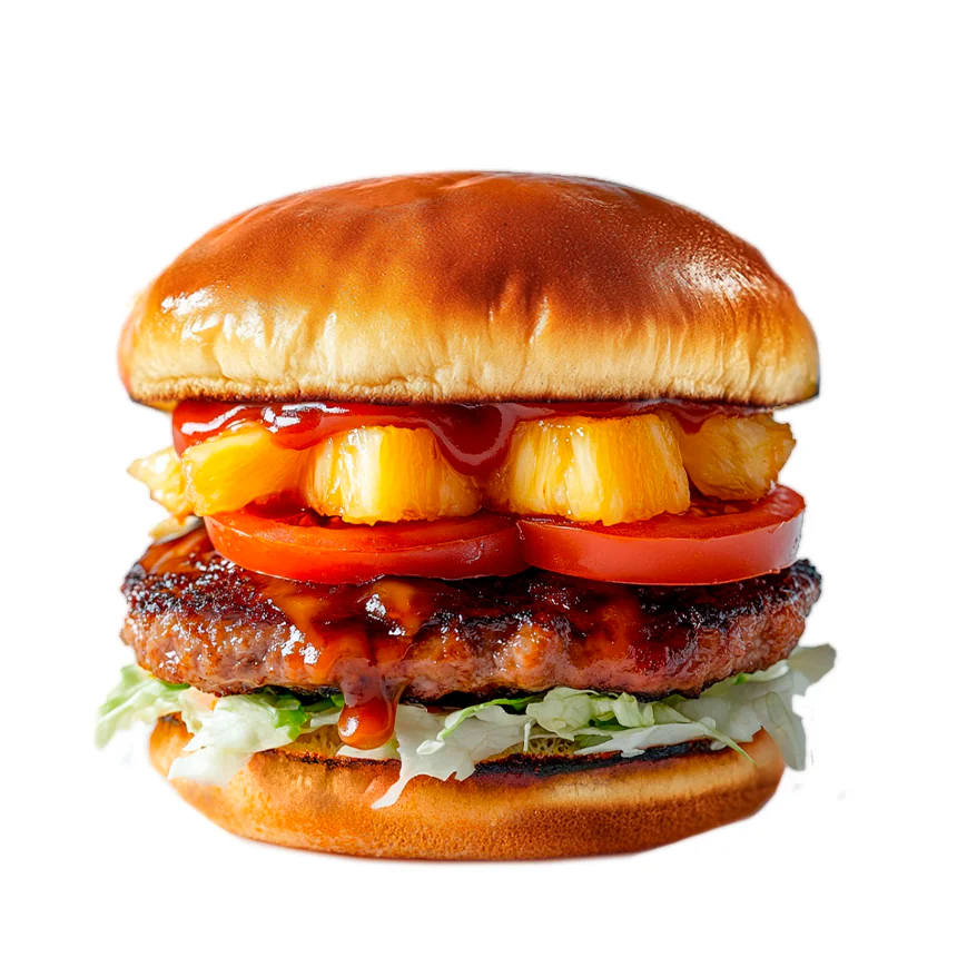 Котлета из говядины, ананас, соус Терияки, сыр Чеддер(в растопленном виде), помидор, лук, салат Айсберг в перемешку с пекинской капустой