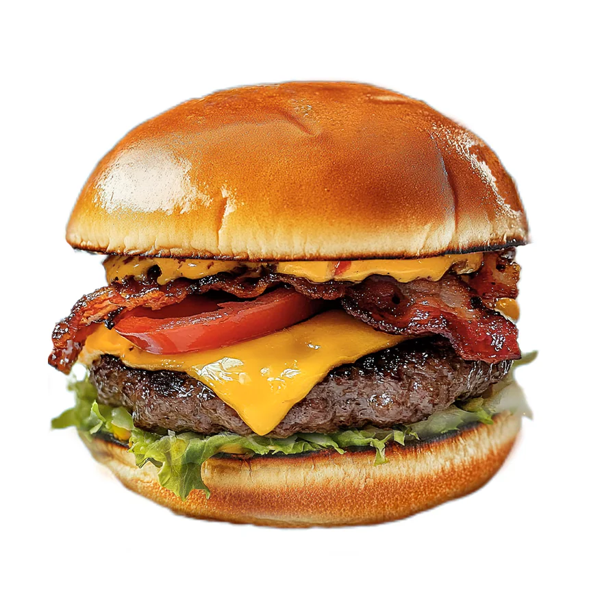 Булочка, фирменный соус, сыр моцарелла, котлета из говядины, сыр чеддер, хрустящий бекон, котлета из говядины, помидоры, маринованные огурцы, кольца красного лука, листья салата, фирменный соус