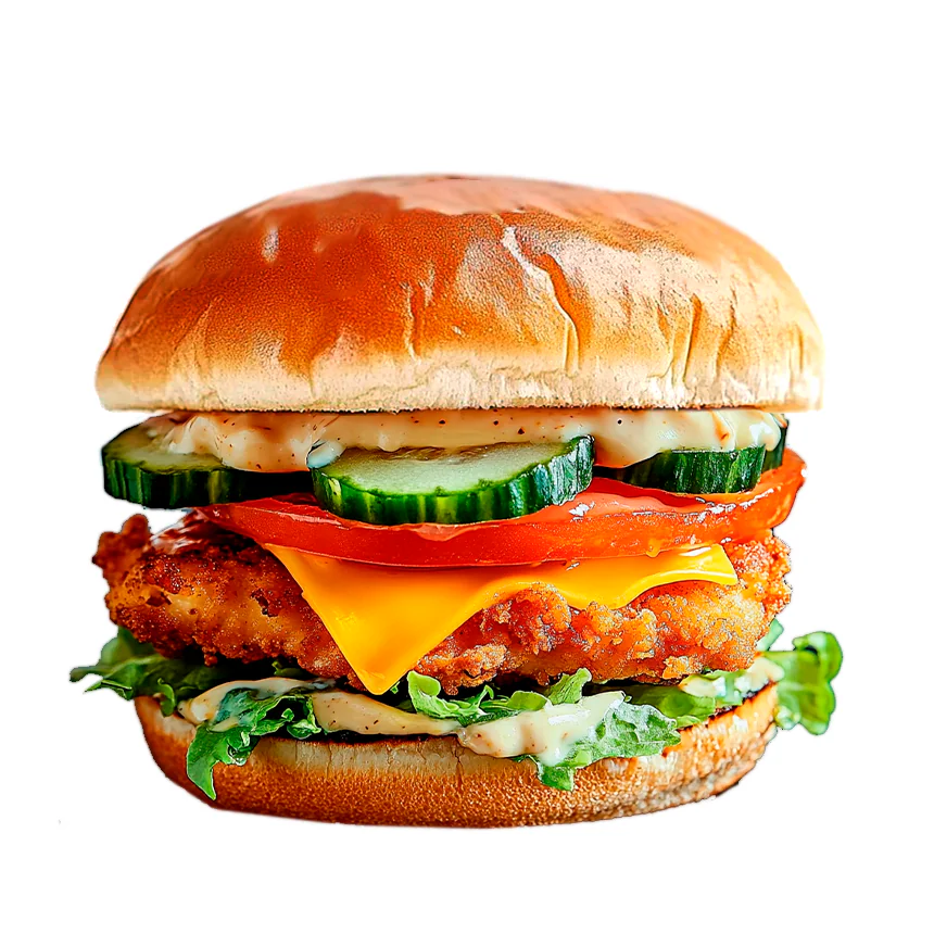 Котлета из сочной курочки, соль, помидоры свежие, огурцы маринованные, соус коктейльный сырный соус, соль, сыр Чеддер(в растопленном виде), салат Айсберг в перемешку с пекинской капустой