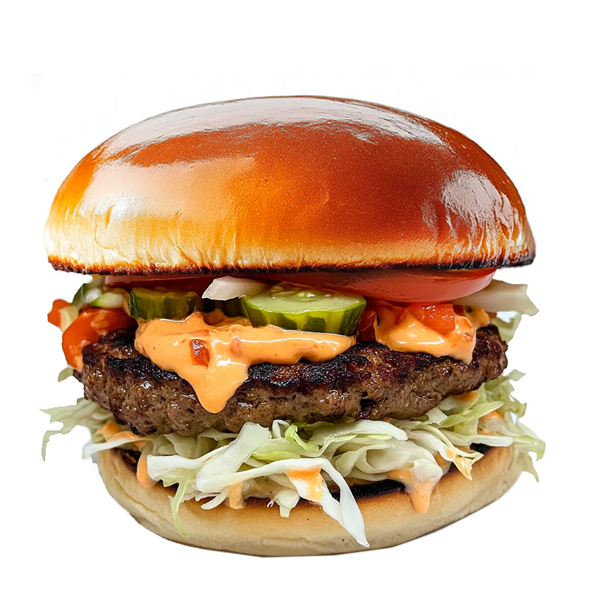Котлета из говядины со специями, бекон, пряный соус, сыр Чеддер(в растопленном виде), помидор, салат Айсберг в перемешку с пекинской капустой