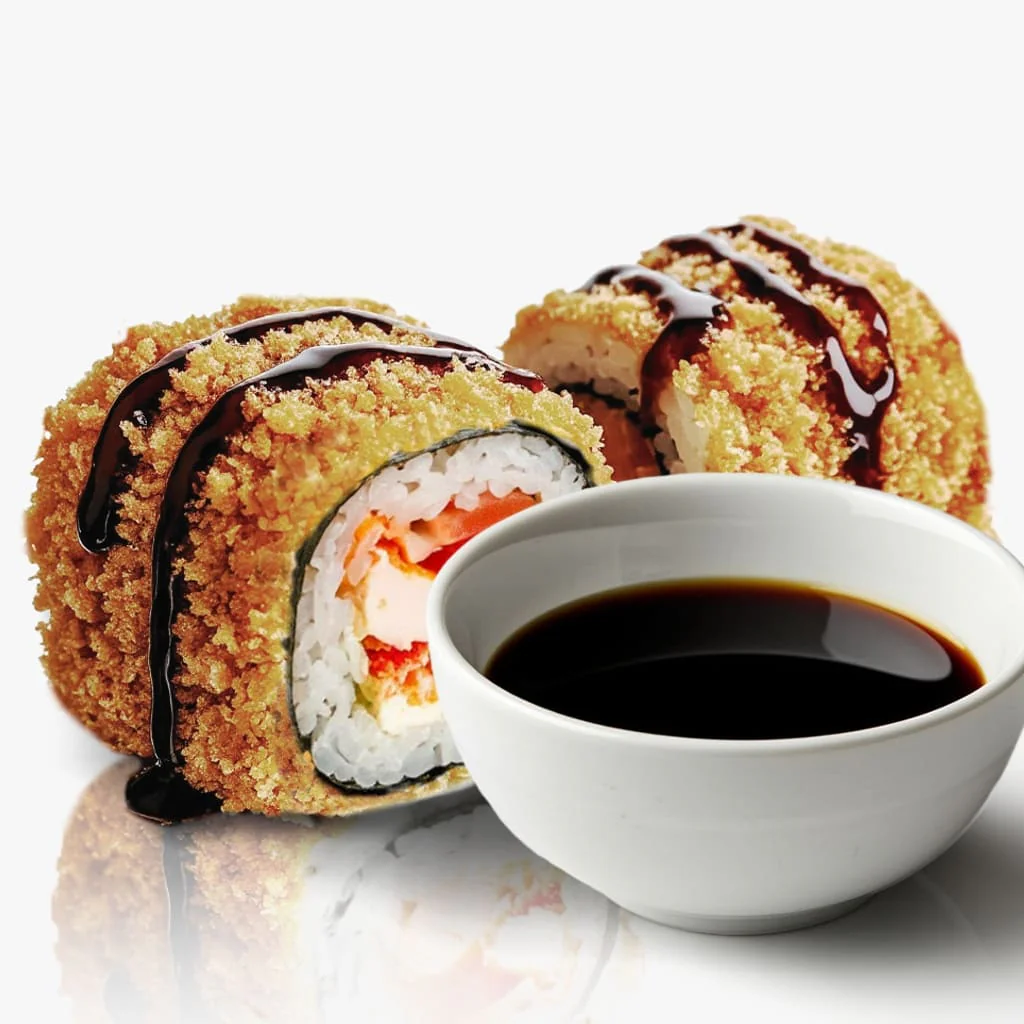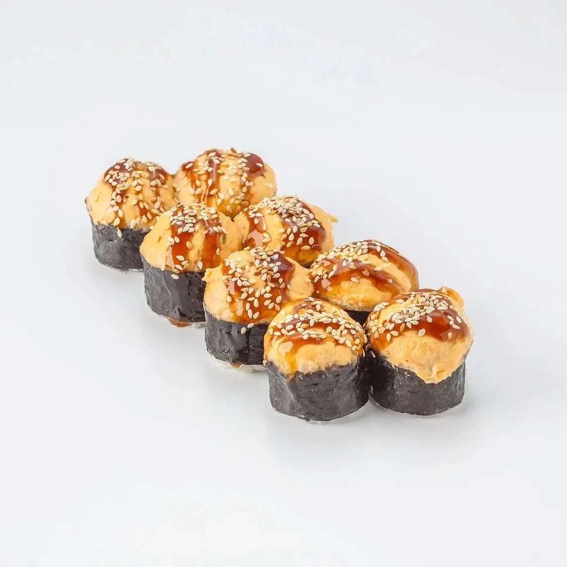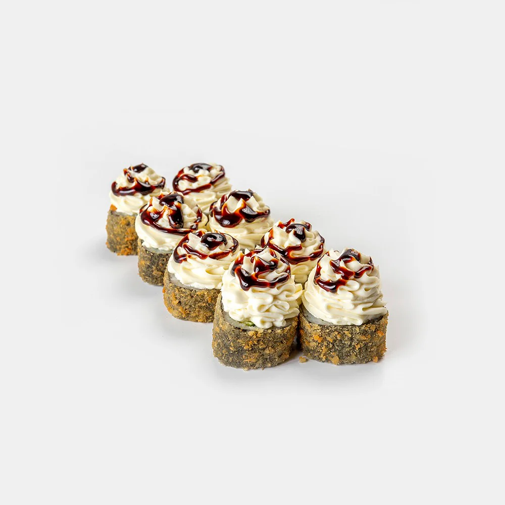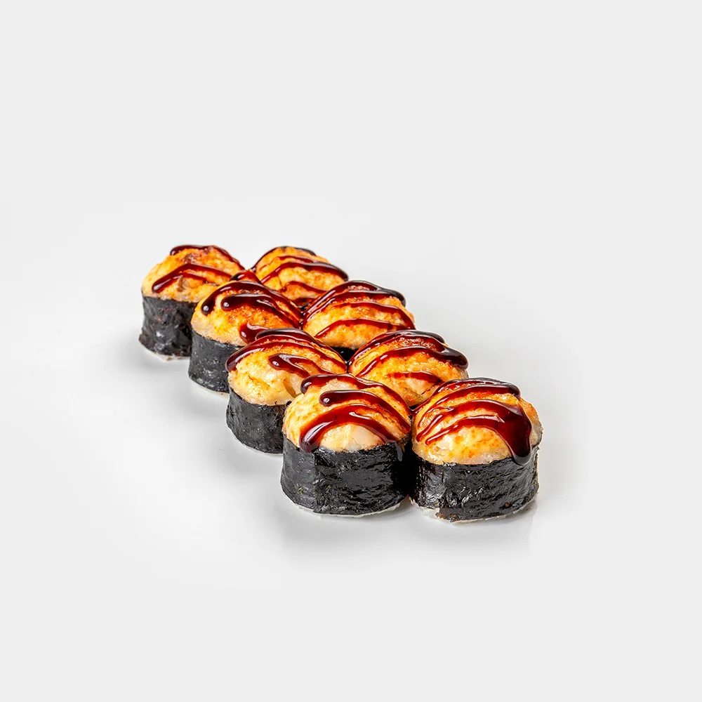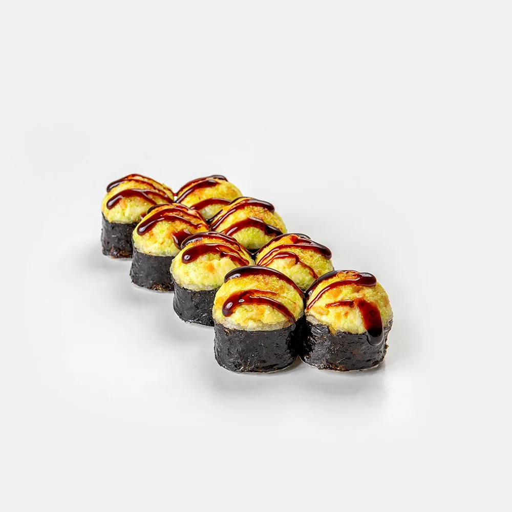 Запеченный ролл. Творожный сыр "Hochland", креветка, фирменный соус, соус унаги, кунжут. Состав включает в себя в том числе и шапочку ролла.
