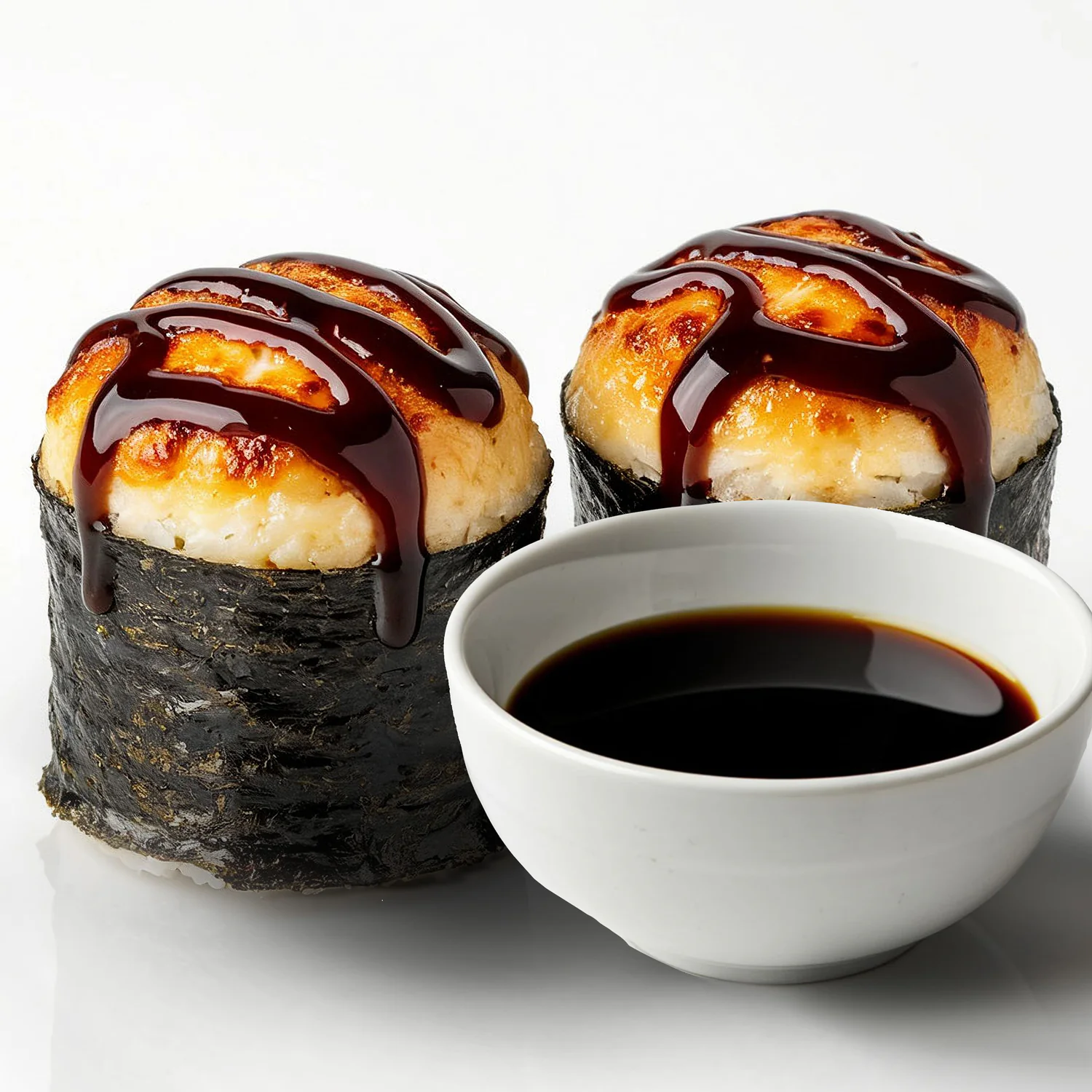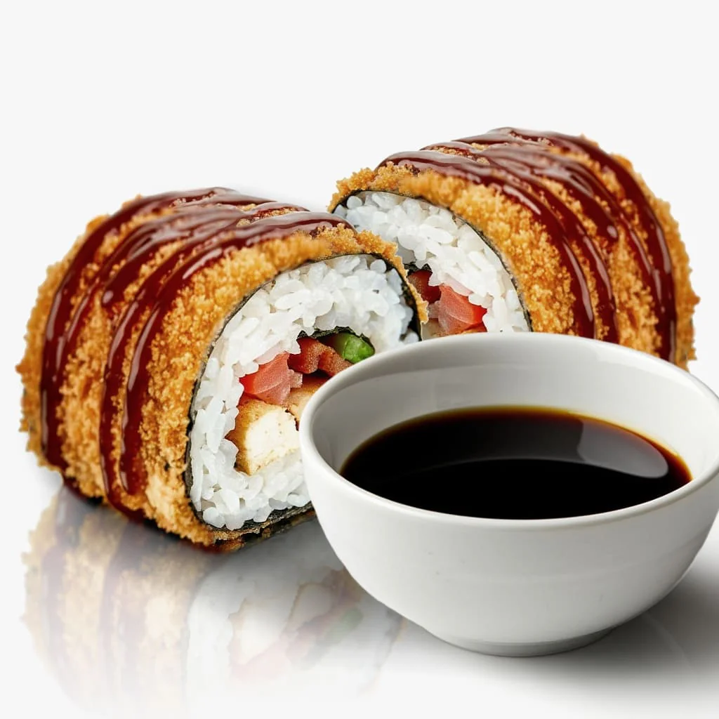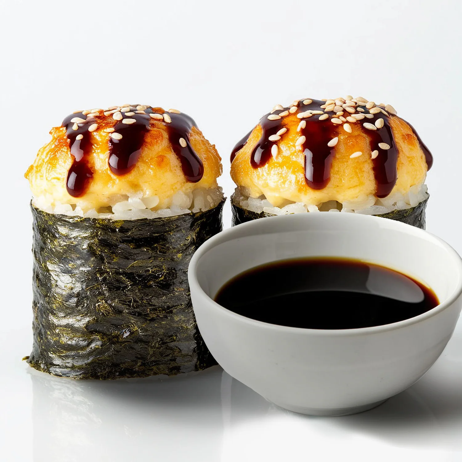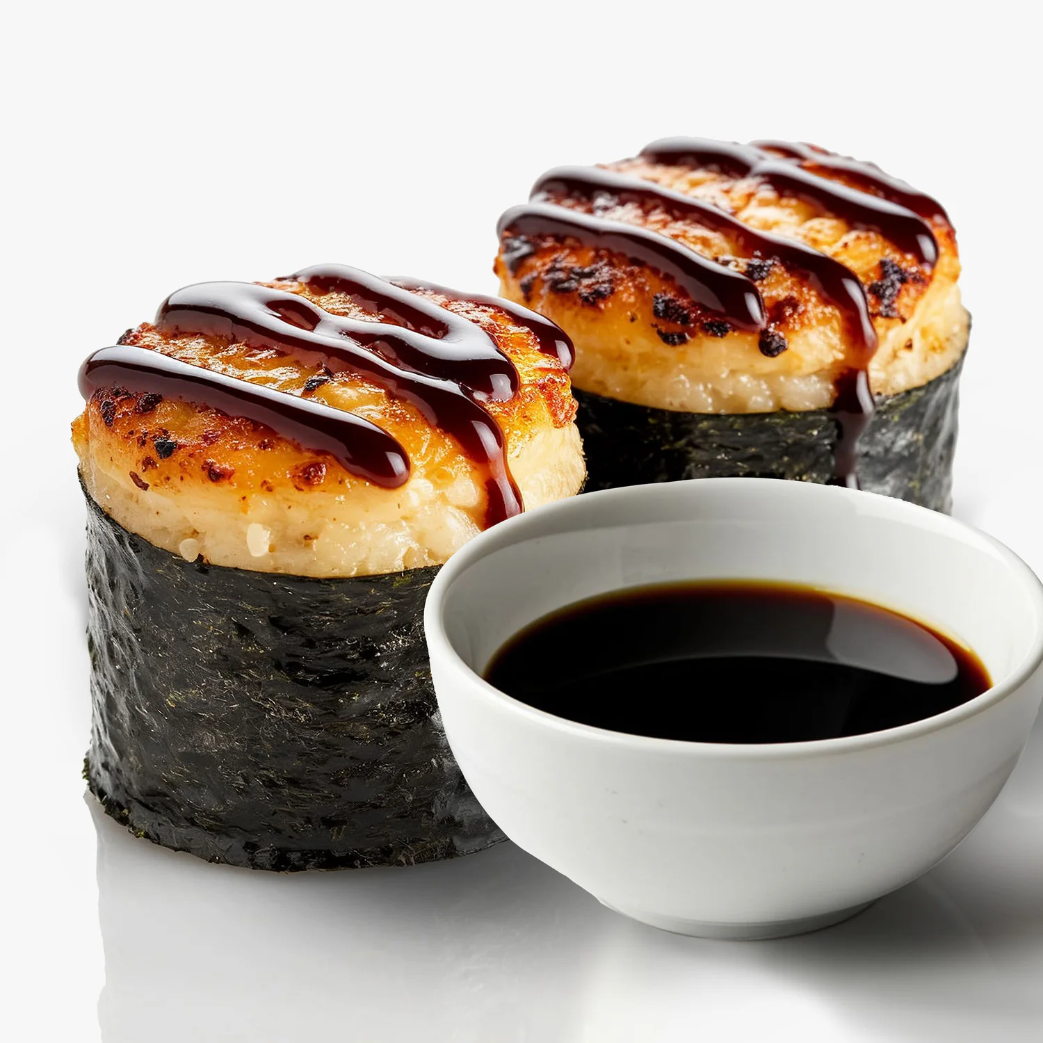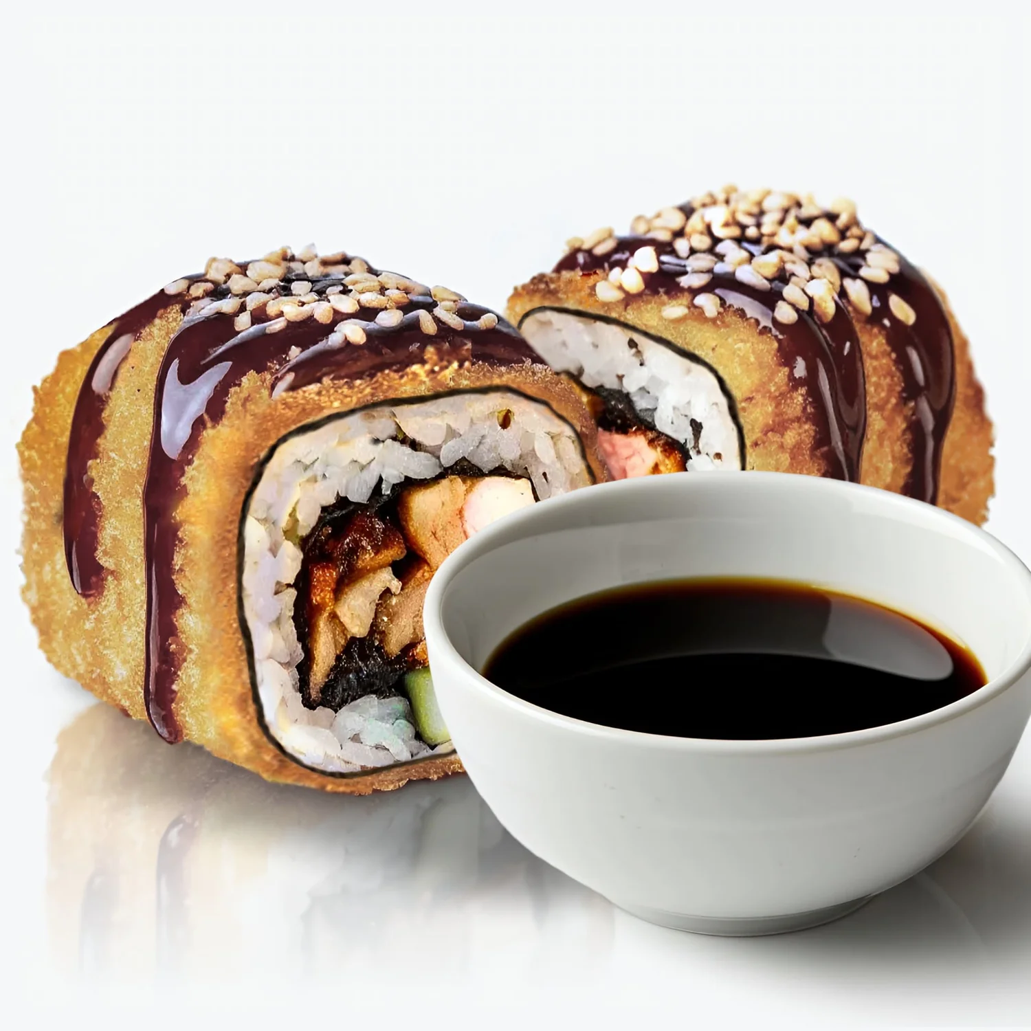 Запеченный ролл. Творожный сыр "Hochland", креветка, фирменный соус, соус унаги, кунжут. Состав включает в себя в том числе и шапочку ролла.
