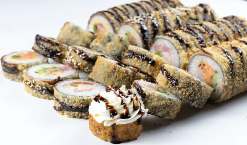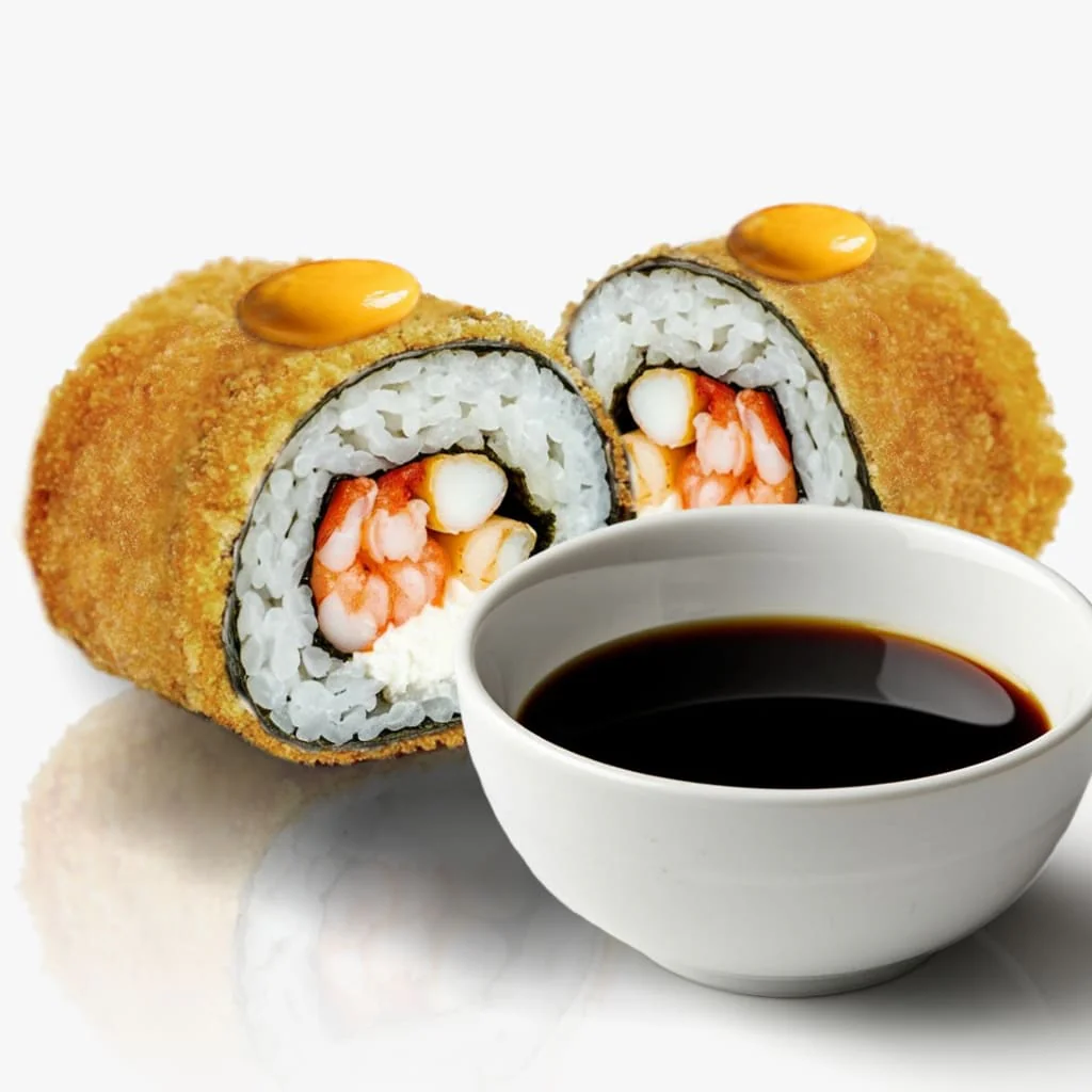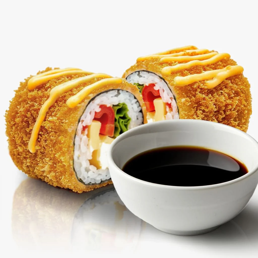 Жаренный ролл. Креветка, тонко нарезанный Лосось, Огурец, Майонез, Сливочный сыр «Hochland»