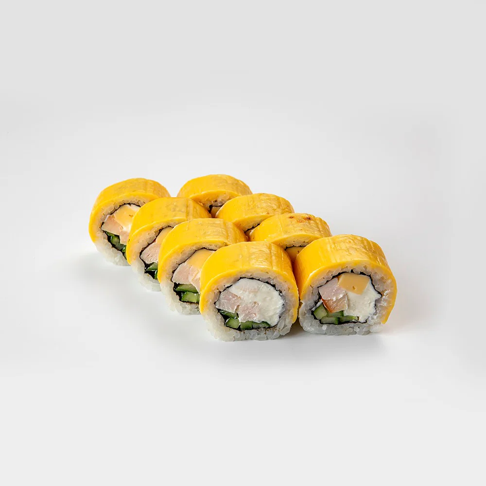 Запеченный ролл. Масаго Зеленая, тонко нарезанный Лосось, Креветка, Майонез, Соус унаги, сыр Чеддер, сыр творожный «Hochland». Состав включает в себя в том числе и шапочку ролла. В ролле присутствует небольшая острота.