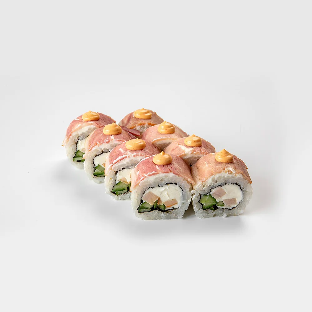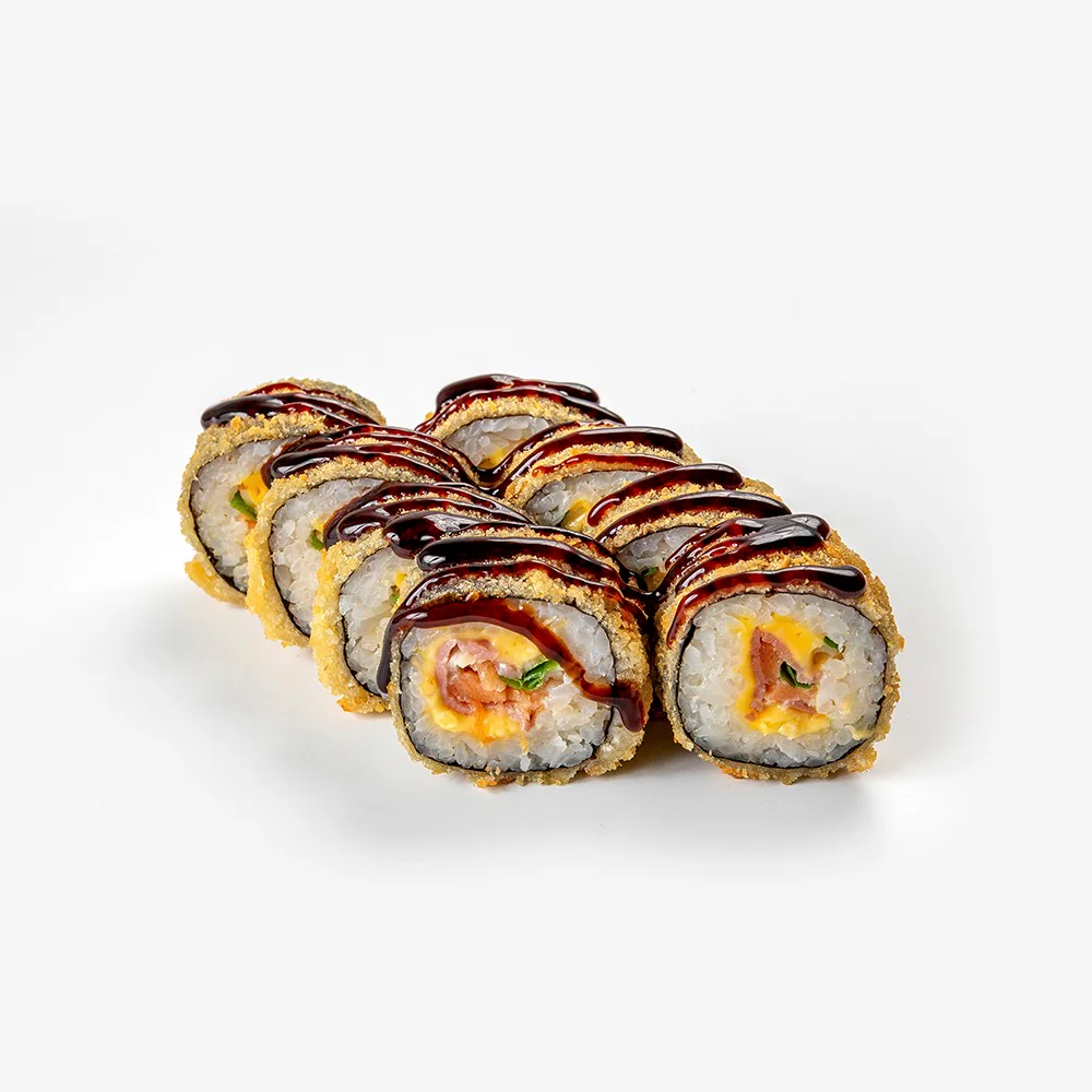 Запеченный ролл. Сливочный сыр, фирменный соус, Огурец, Креветка, Унаги, тонко нарезанный Лосось, сыр Чеддер. Состав включает в себя в том числе и шапочку ролла. Возможна небольшая острота в ролле.