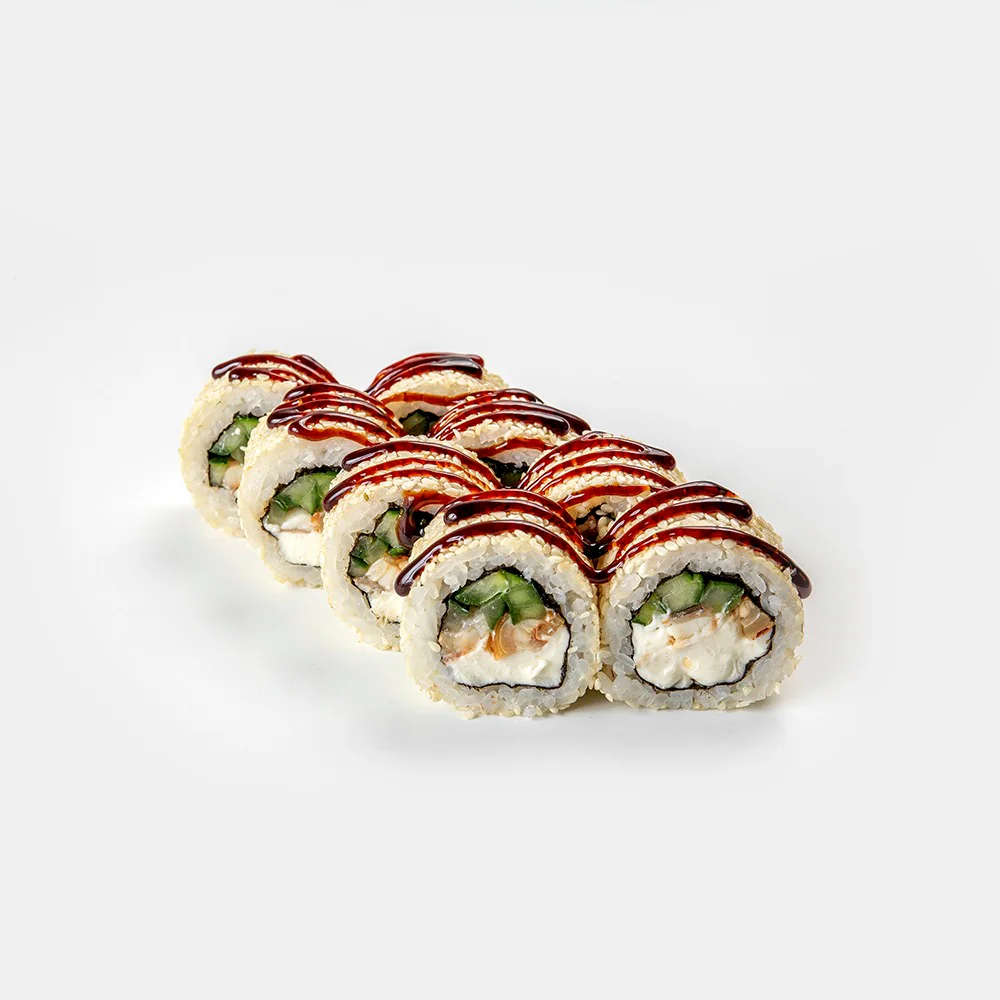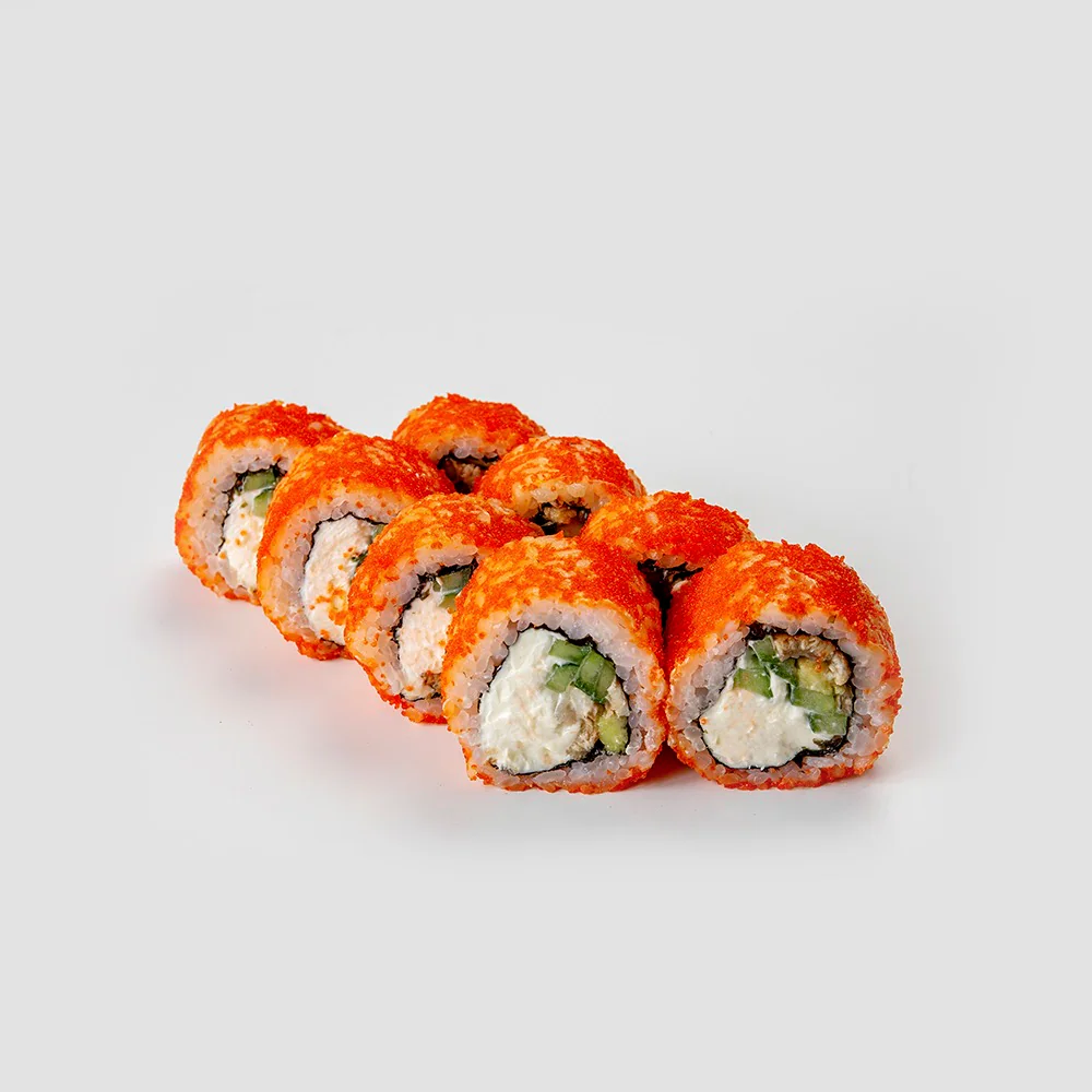 Угорь, тобико, дайкон маринованный, огурец, сливочный сыр