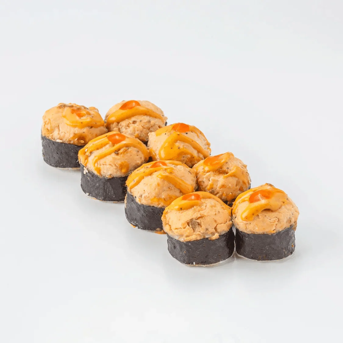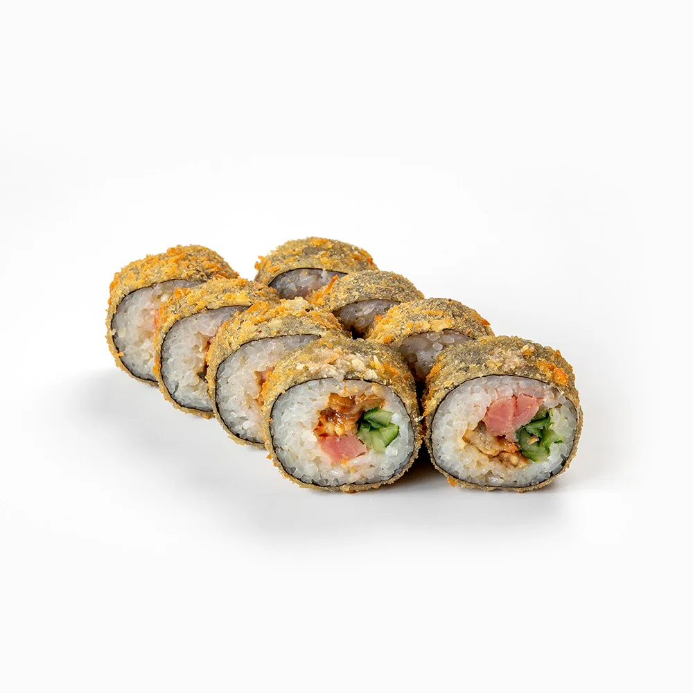 Запеченный ролл. Творожный сыр "Hochland", копченый тунец, креветки, соус спайс. Состав включает в себя в том числе и шапочку ролла. Ролл с остринкой.
