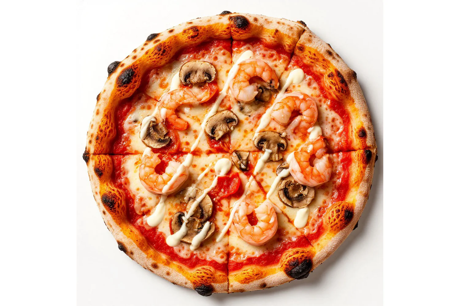 Неаполитанская пицца, Состав - моцарелла, креветки, томаты, шампиньоны, фирменный соус. Диаметр пиццы - 30 см