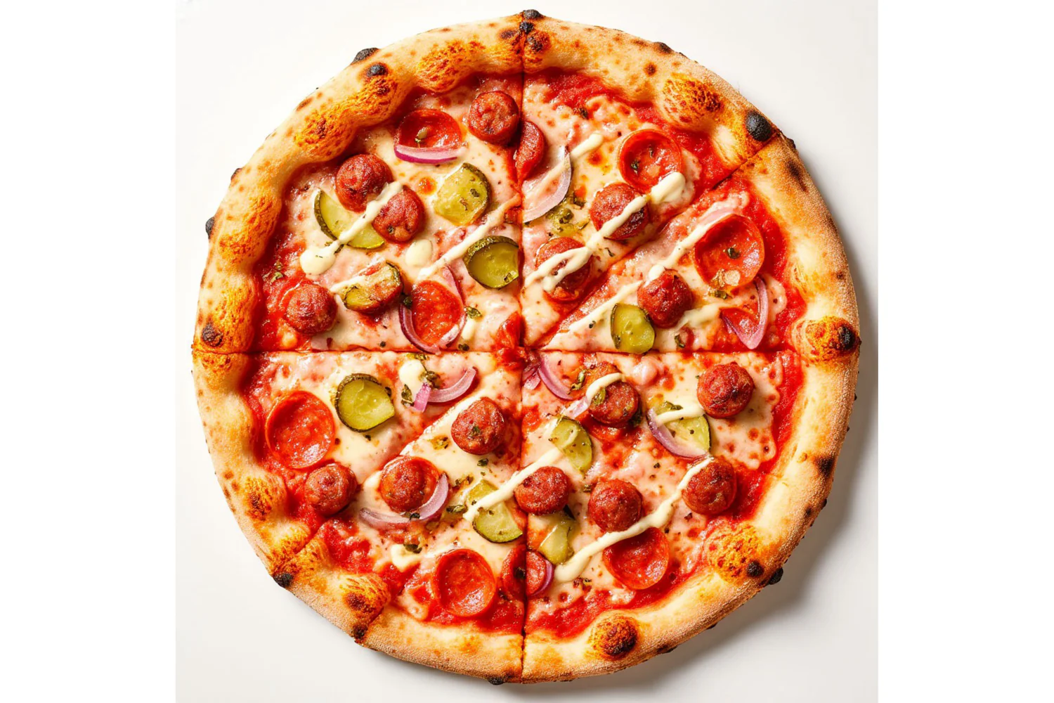 Неаполитанская пицца. Состав - моцарелла, томаты, красный лук, маринованные огурцы, баварские колбаски. Фирменный соус. Диаметр пиццы - 30 см
