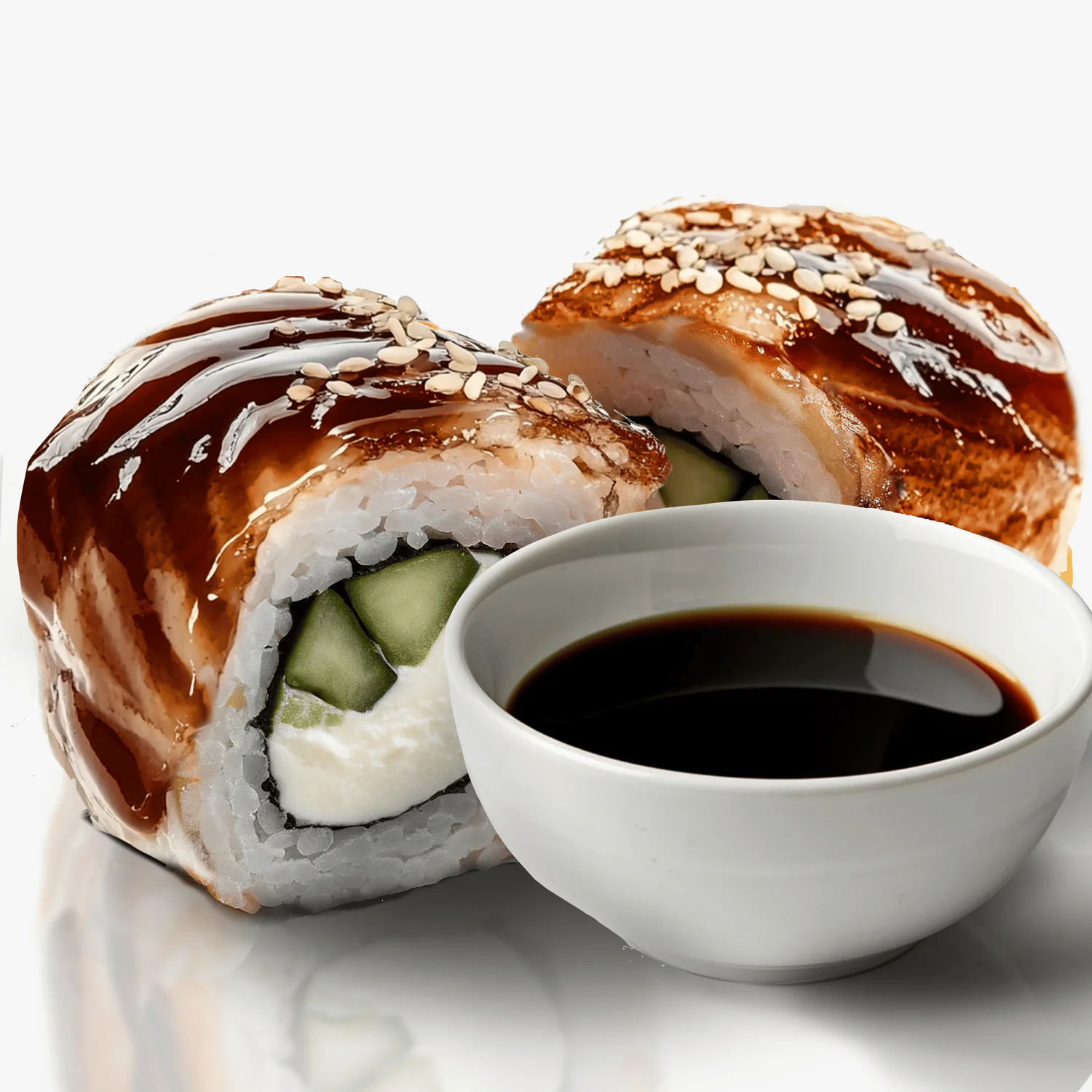 Творожный сыр, угорь, огурец, соус унаги, кунжут