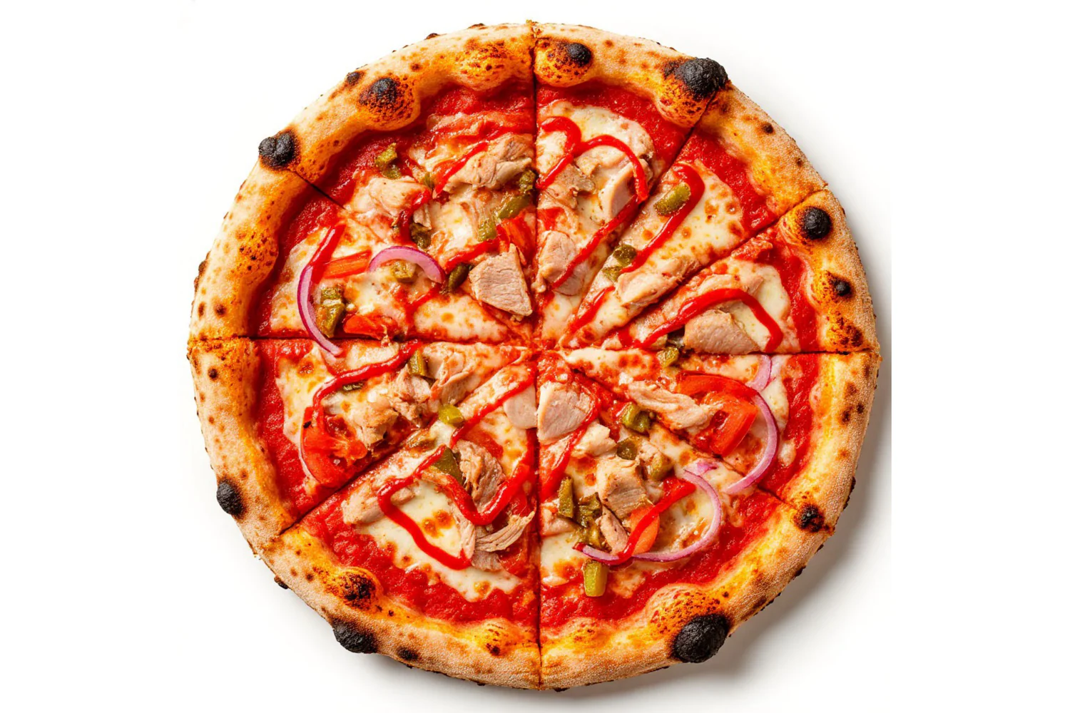 Неаполитанская пицца. Состав - куриное филе, мякоть свинины, перец болгарский, томаты, лук красный, фирменный соус. Диаметр пиццы - 30 см.