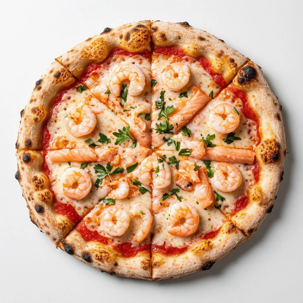 Неаполитанская пицца. Состав - моцарелла, лосось, креветки, пармезан, фирменный соус.