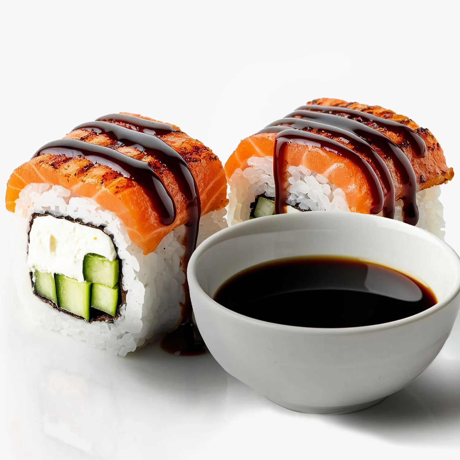 Запеченный ролл. Сыр творожный «Hochland», Масаго Чёрная, тонко нарезанный Лосось, Угорь, Майонез, Соус унаги. Состав включает в себя в том числе и шапочку ролла.