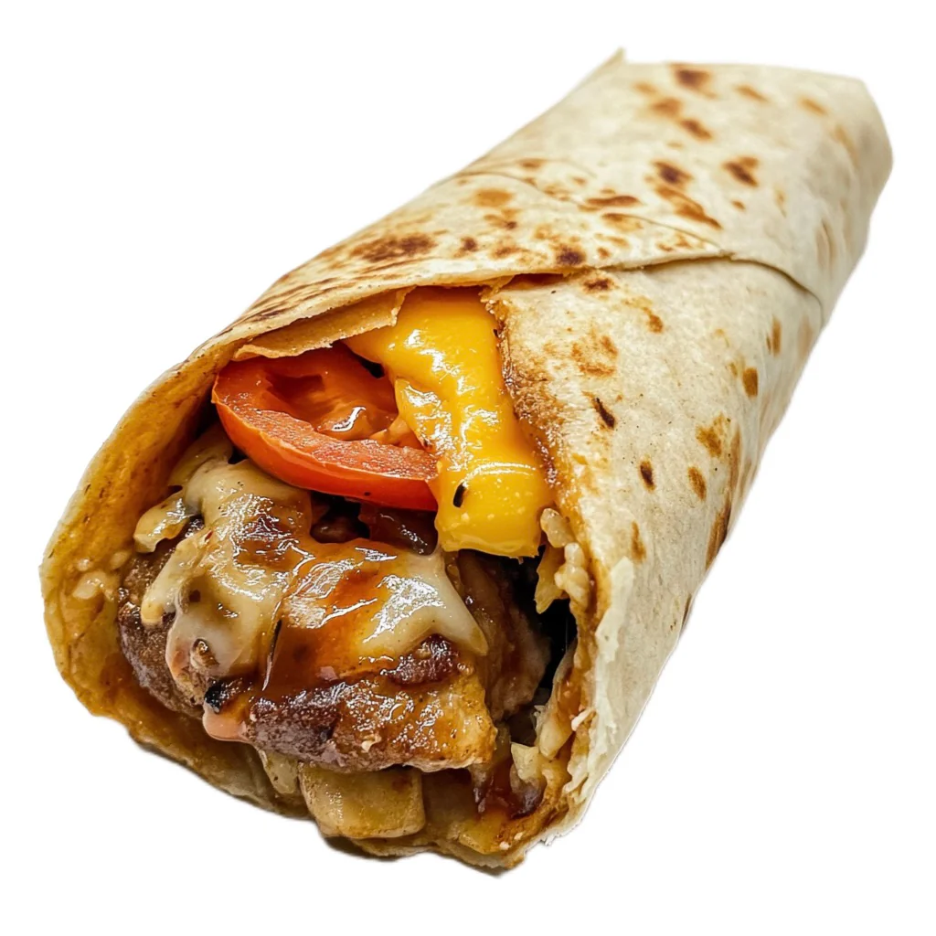 Обжаренная куриная котлета, ломтик помидора и зрелый сыр в пресной пшеничной лепешке, заправленной специальным соусом