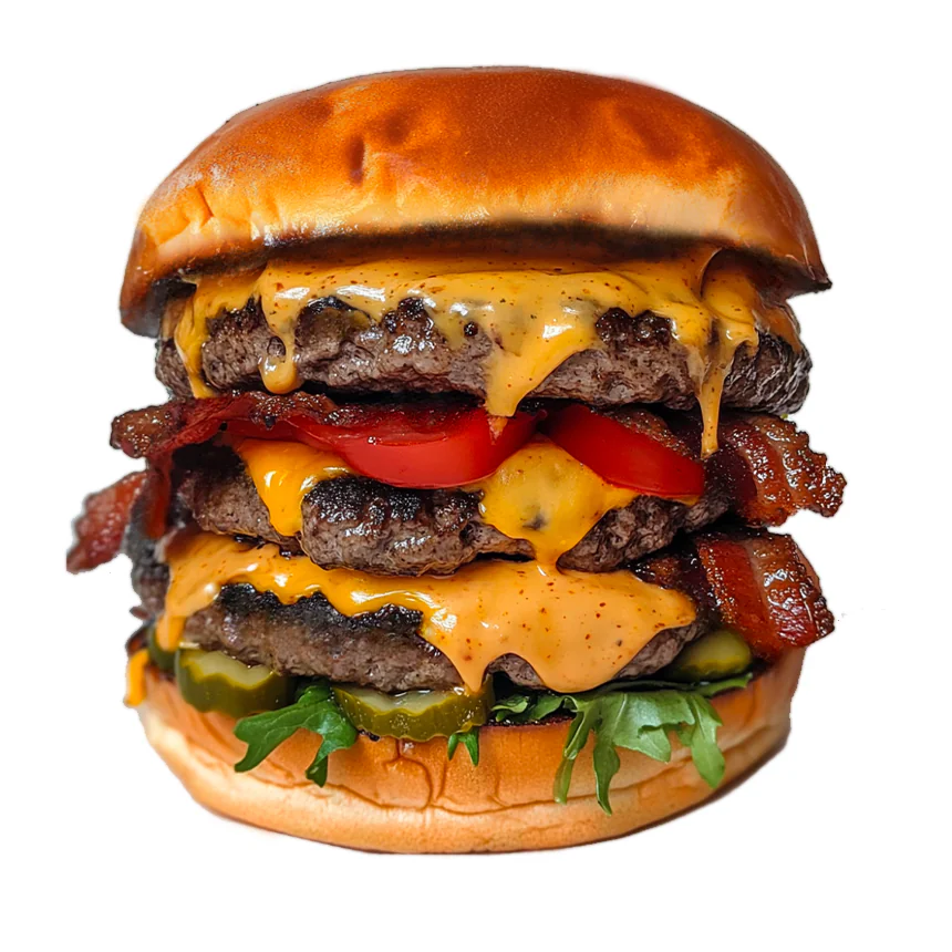 Булочка, двойной сыр моцарелла, двойной сыр Чеддер(в растопленном виде), три большие котлеты из говядины, двойная порция бекона, фирменный соус, соус на сырной основе, помидоры, маринованные огурцы, листья салата