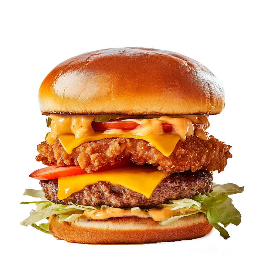 Булочка, сыр моцарелла, сыр Чеддер, котлета из говядины, котлета из курицы, фирменный соус, помидоры, мвринованные огурцы, болгарский перец, листья салата