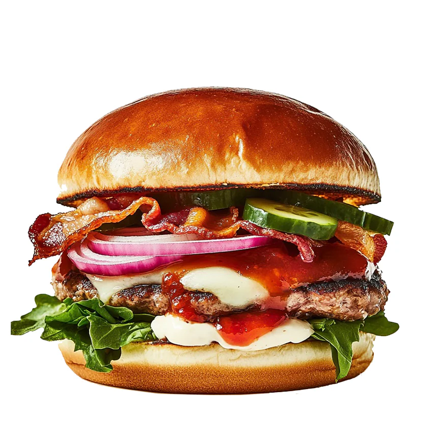 Булочка, фирменный соус, сыр моцарелла, котлета из говядины, сыр чеддер, хрустящий бекон, котлета из говядины, помидоры, маринованные огурцы, кольца красного лука, листья салата, фирменный соус