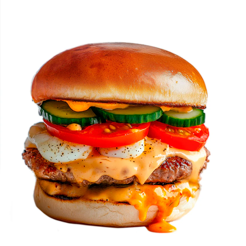 Котлета из говядины, свежие помидоры, маринованные огурцы, коктейльный соус, соль, яйцо куриное, печеный перец, фирменный соус