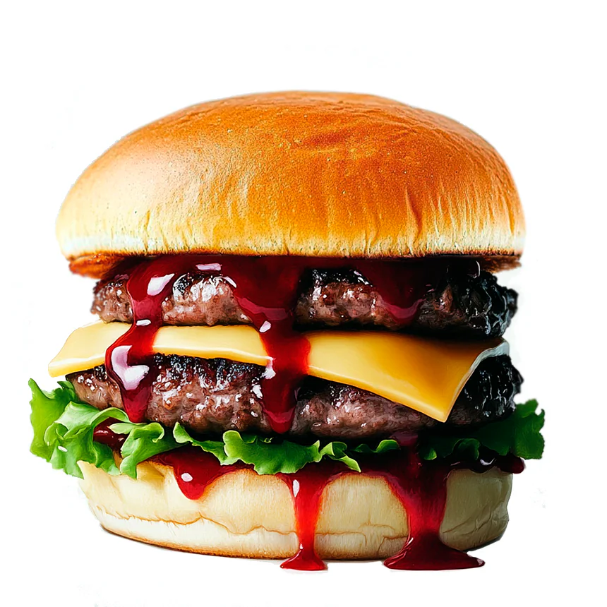 Две котлеты из говядины, сыр Чеддер, лук, листья салата, пикантный соус