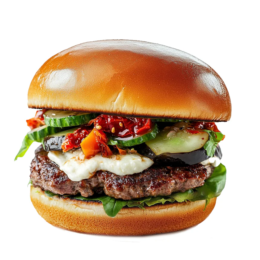Котлета из говядины, свежие огурцы, томаты, болгарский перец, моцарелла, баклажан, соус, салат Айсберг в перемешку с пекинской капустой