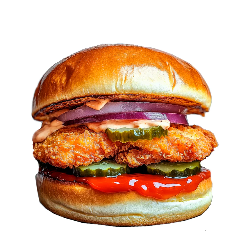 Куриное филе в специях обжаренное во фритюре, с маринованными огурчиками, сочным луком, заправленные кетчупом и майонезным соусом. Возможна небольшая острота продукта.