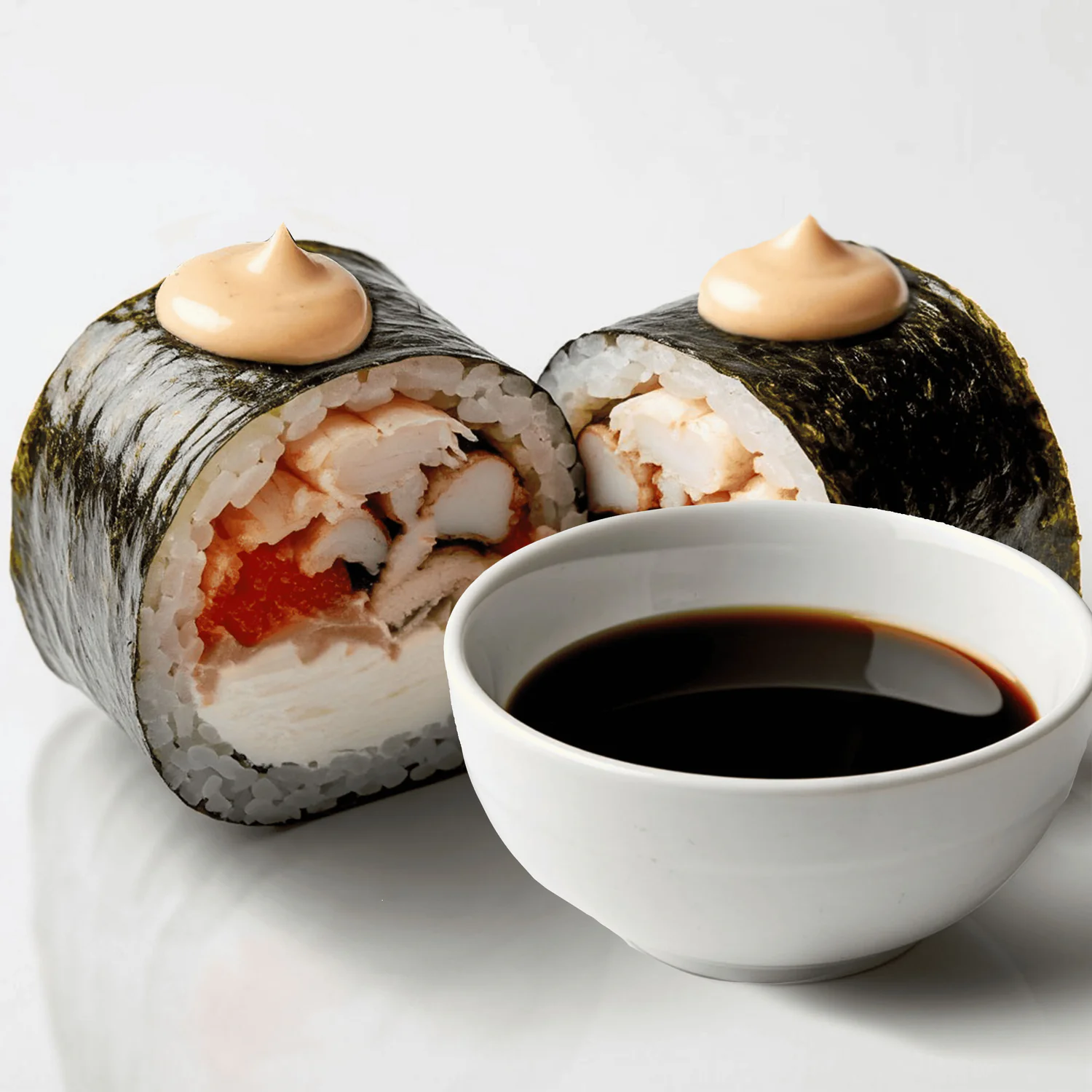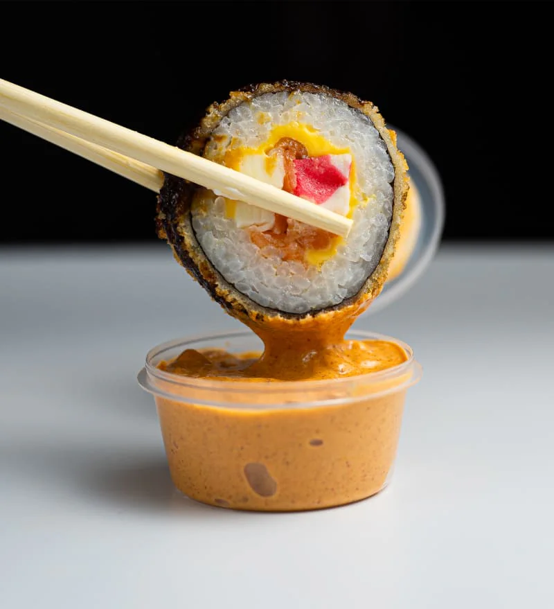 Творожный сыр "Hochland", копченый тунец, креветки, соус спайс. Состав включает в себя в том числе и шапочку ролла. Ролл с остринкой.