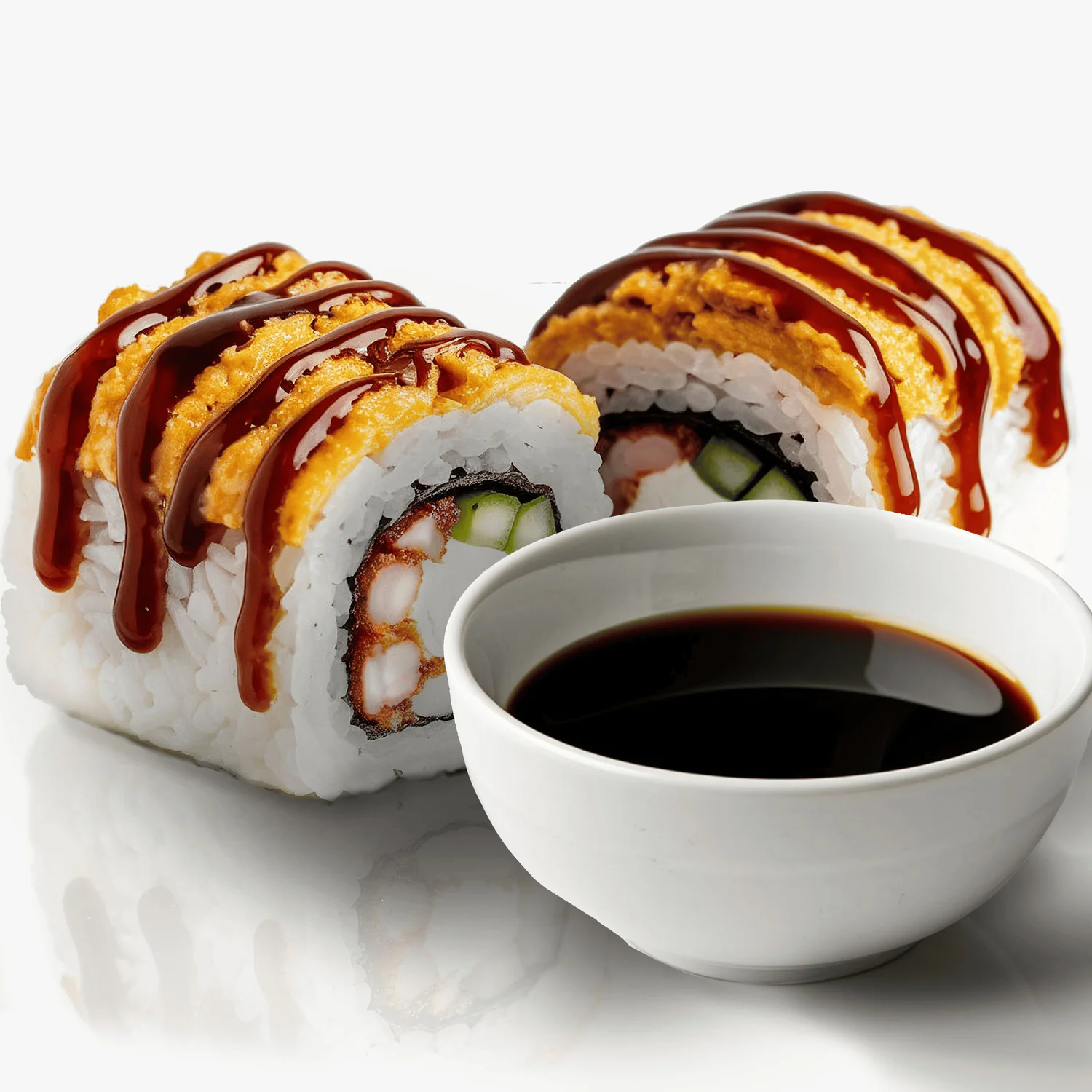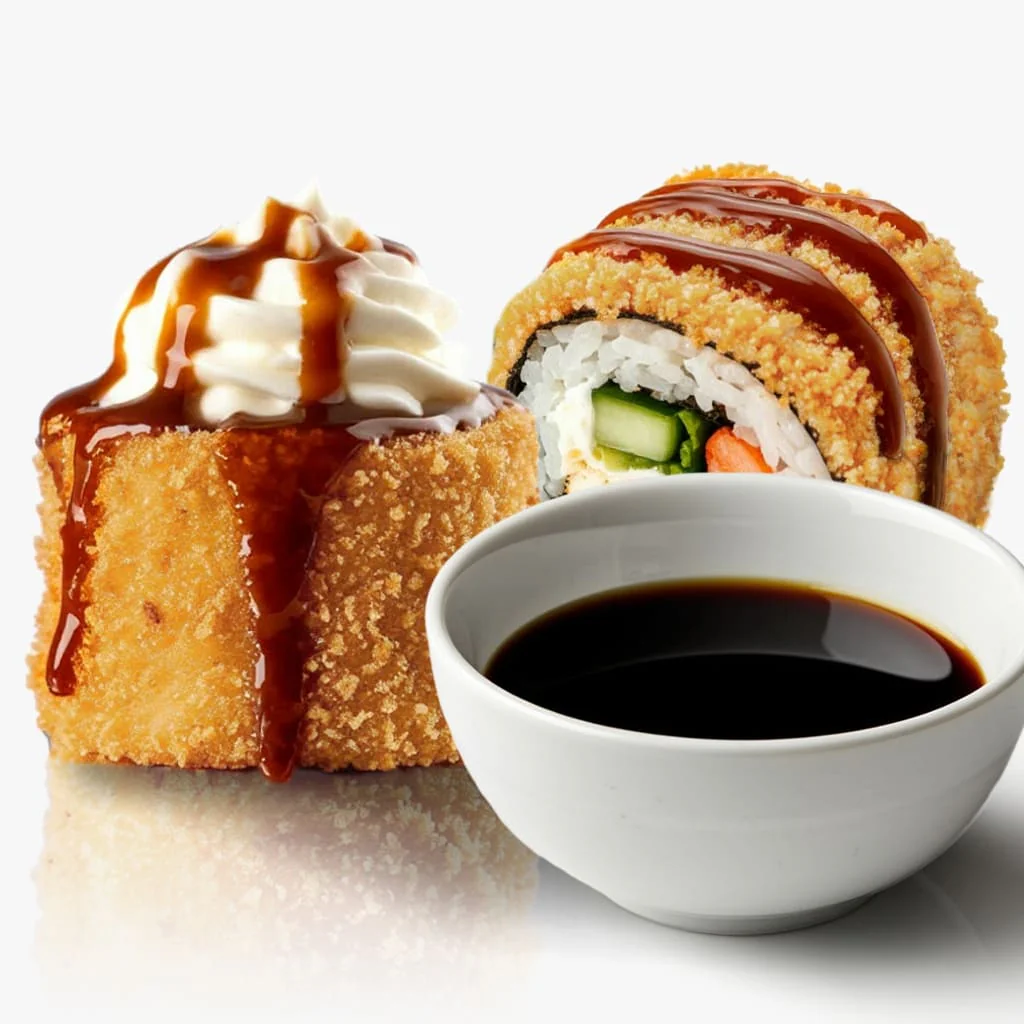 Творожный сыр "Hochland", креветка, фирменный соус, соус унаги, кунжут. Состав включает в себя в том числе и шапочку ролла.