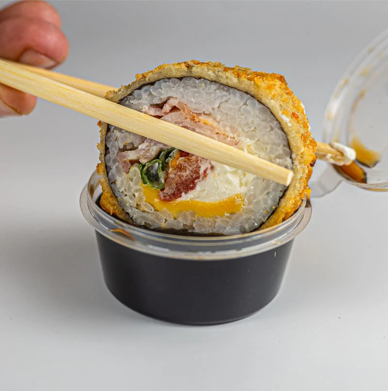 Жаренный ролл. Бекон Курица копчёная Помидор Майонез Лук зеленый
