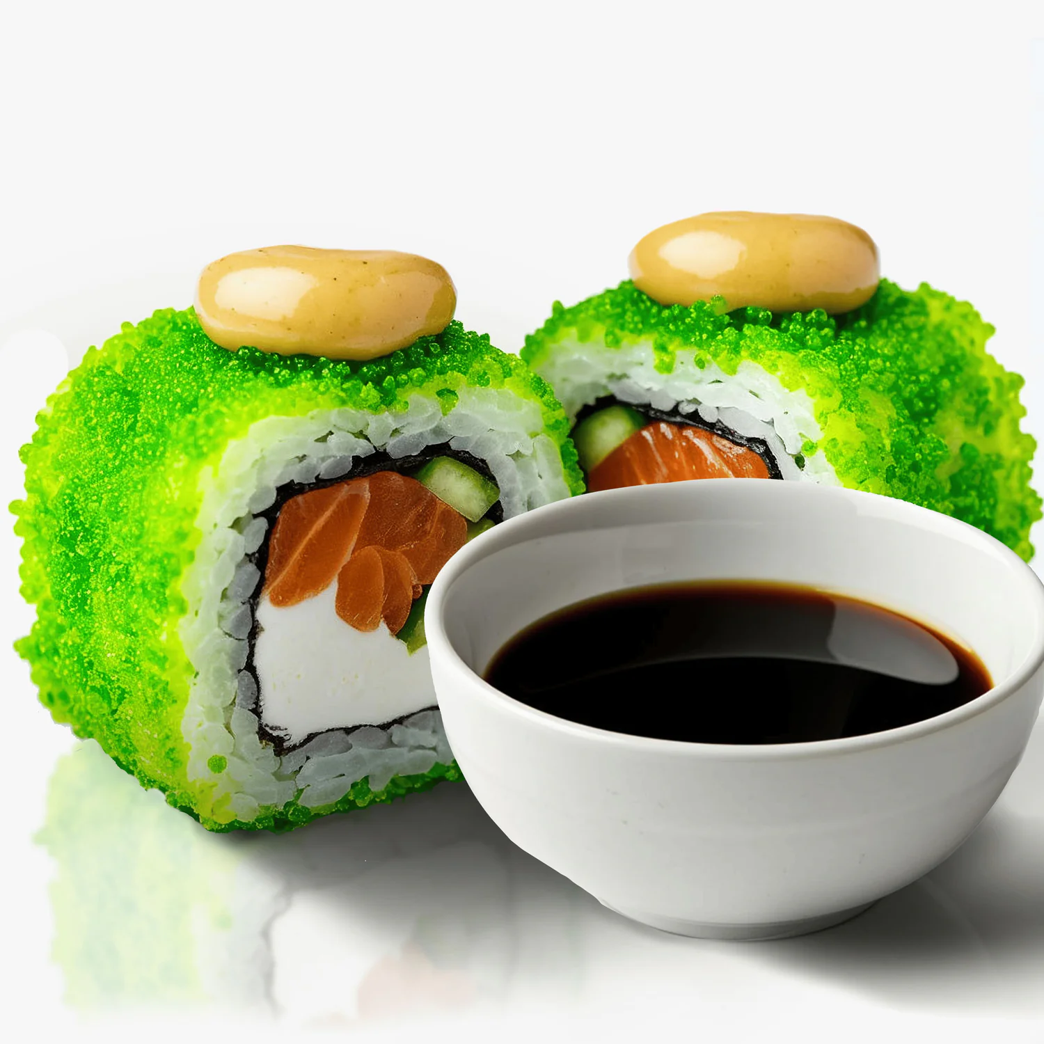 Запеченный ролл. Масаго Зеленая, тонко нарезанный Лосось, Креветка, Майонез, Соус унаги, сыр Чеддер, сыр творожный «Hochland». Состав включает в себя в том числе и шапочку ролла. В ролле присутствует небольшая острота.