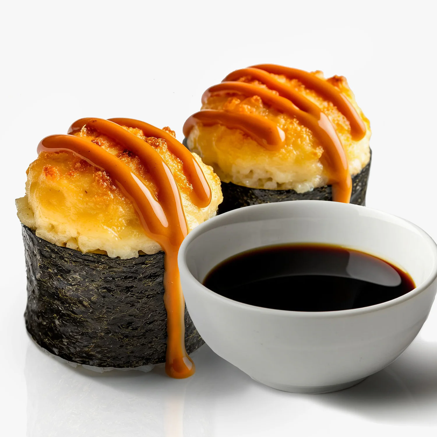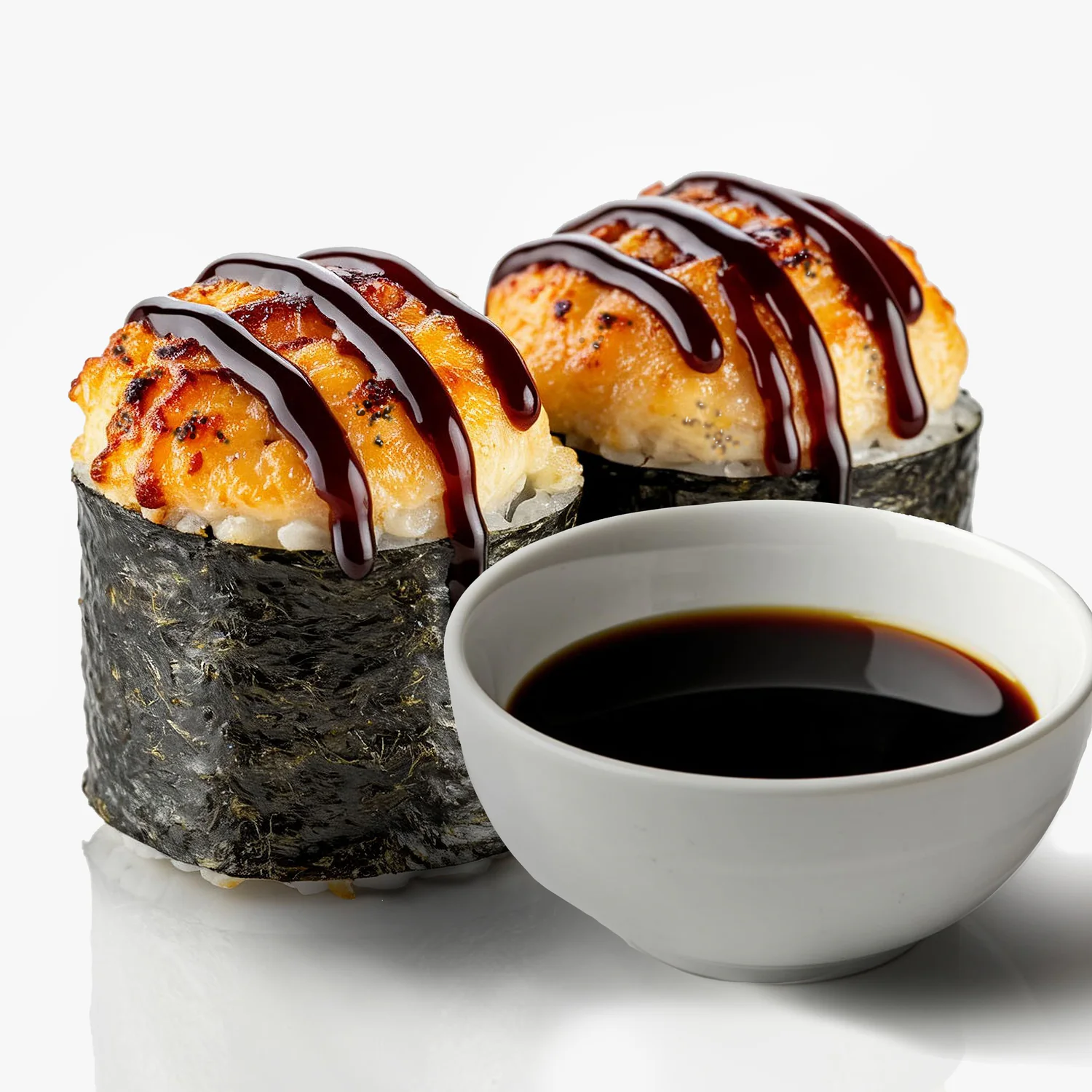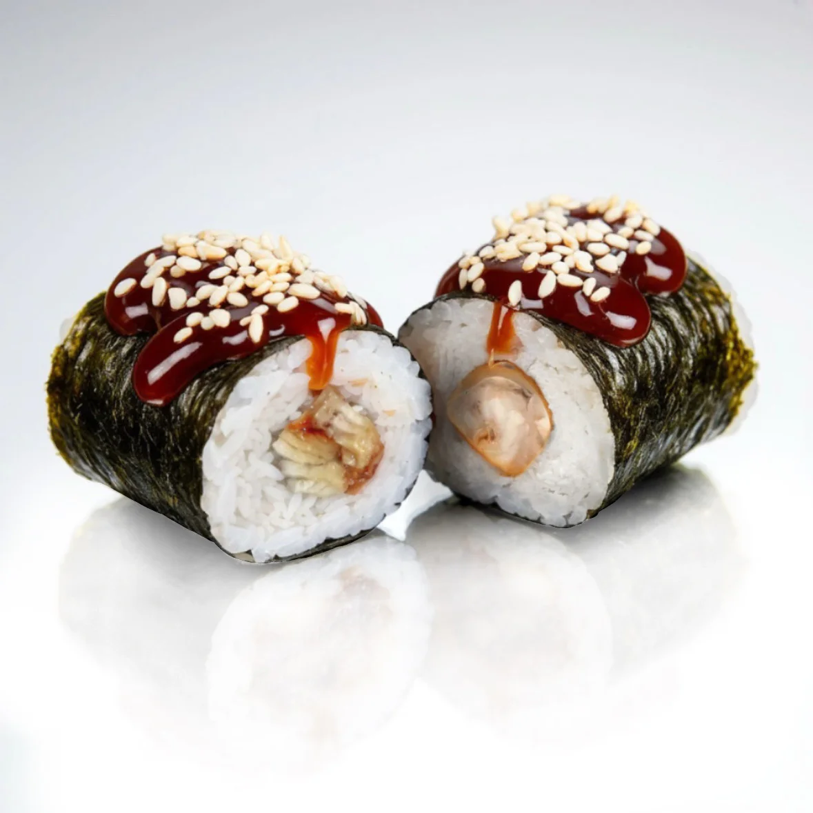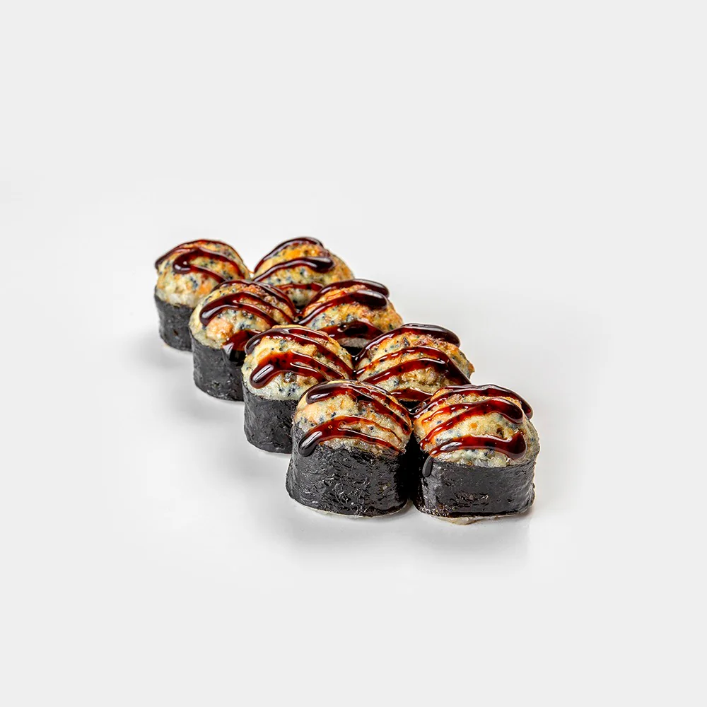Запеченный ролл. Творожный сыр "Hochland", креветка, фирменный соус, соус унаги, кунжут. Состав включает в себя в том числе и шапочку ролла.