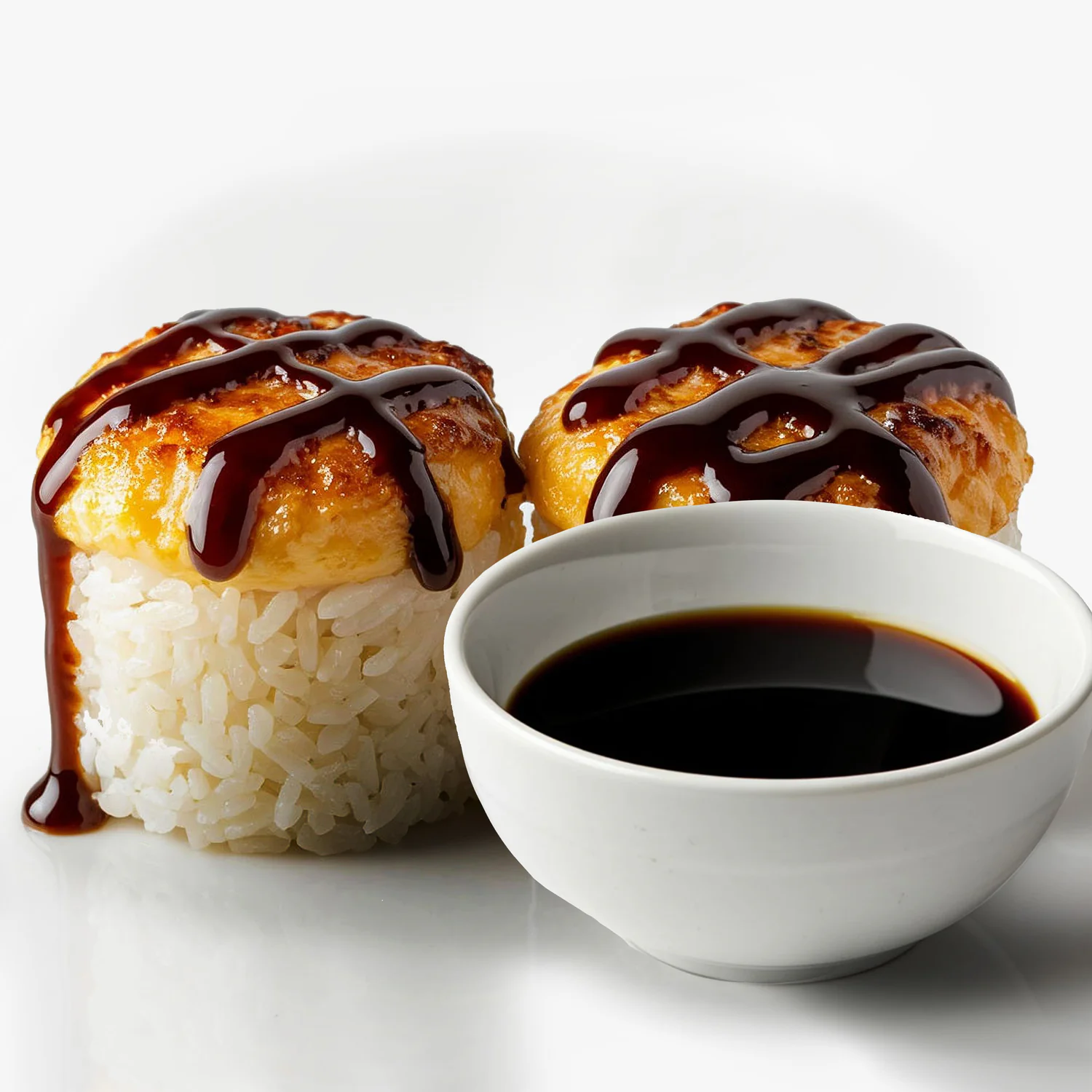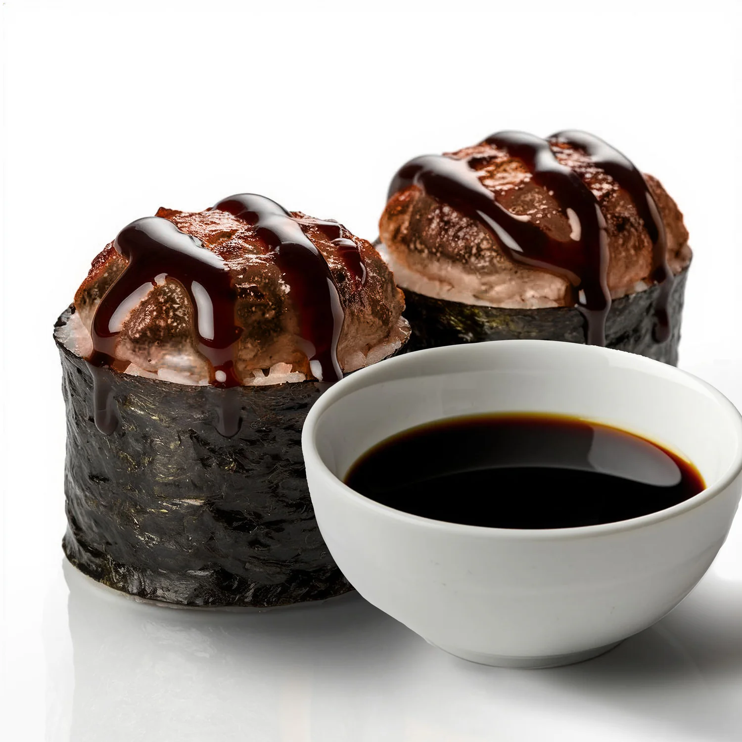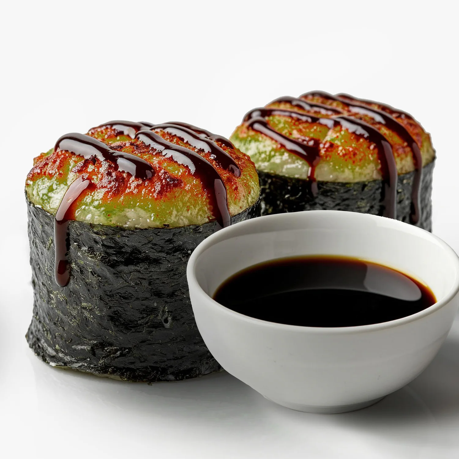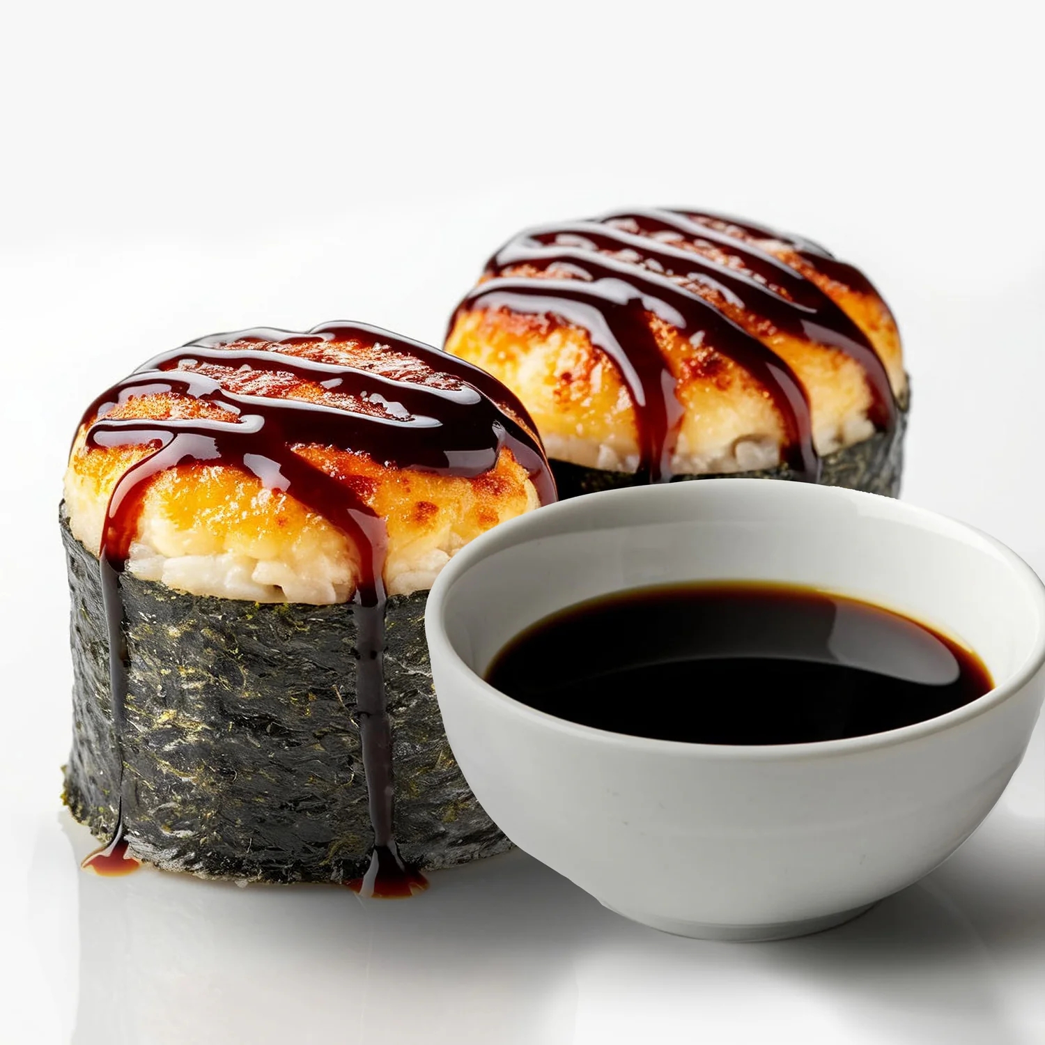 Запеченный ролл. Творожный сыр "Hochland", креветка, фирменный соус, соус унаги, кунжут. Состав включает в себя в том числе и шапочку ролла.