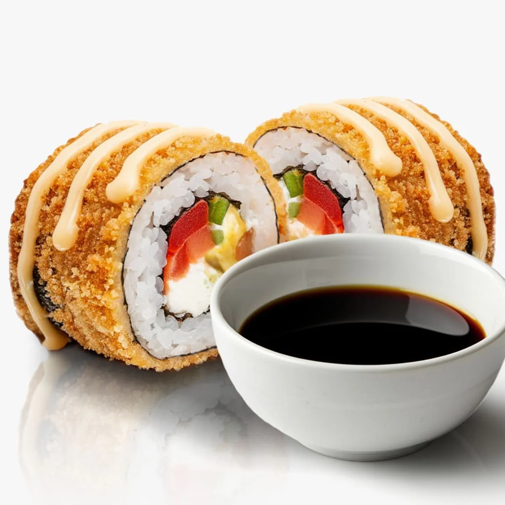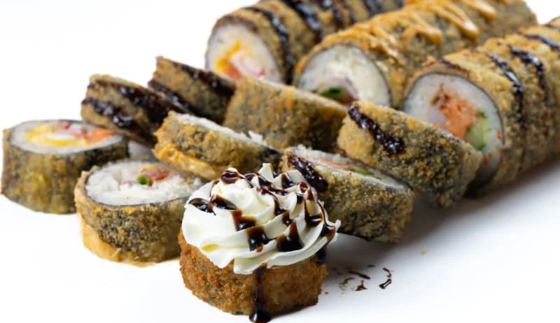 Жаренный ролл. Креветка, тонко нарезанный Лосось, Огурец, Майонез, Сливочный сыр «Hochland»