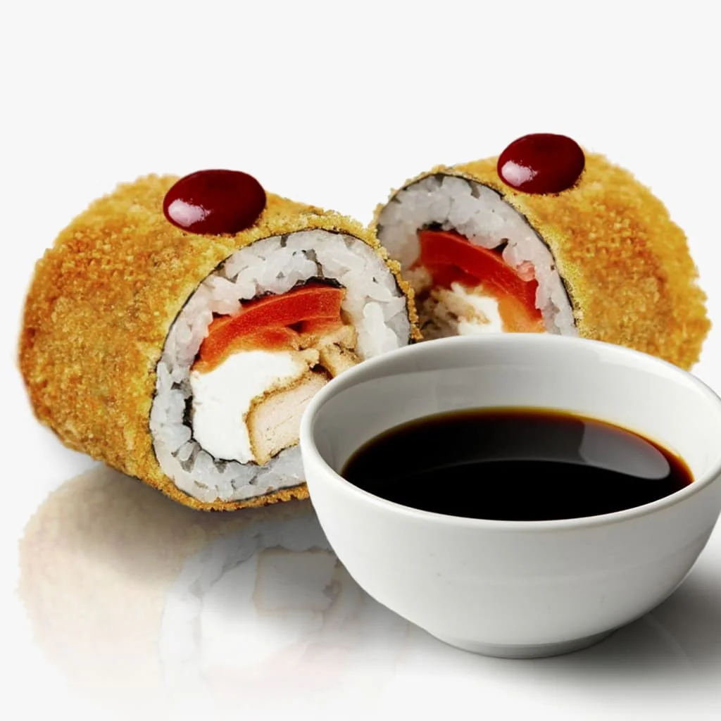 Запеченный ролл. Творожный сыр "Hochland", копченый тунец, креветки, соус спайс. Состав включает в себя в том числе и шапочку ролла. Ролл с остринкой.