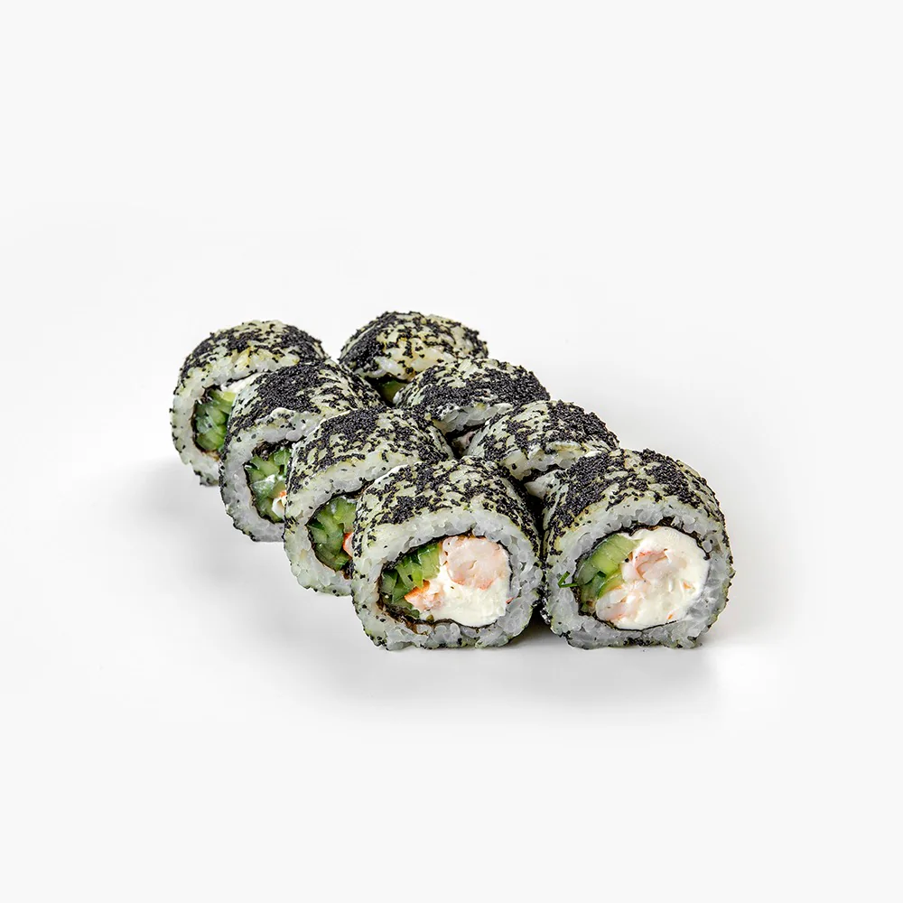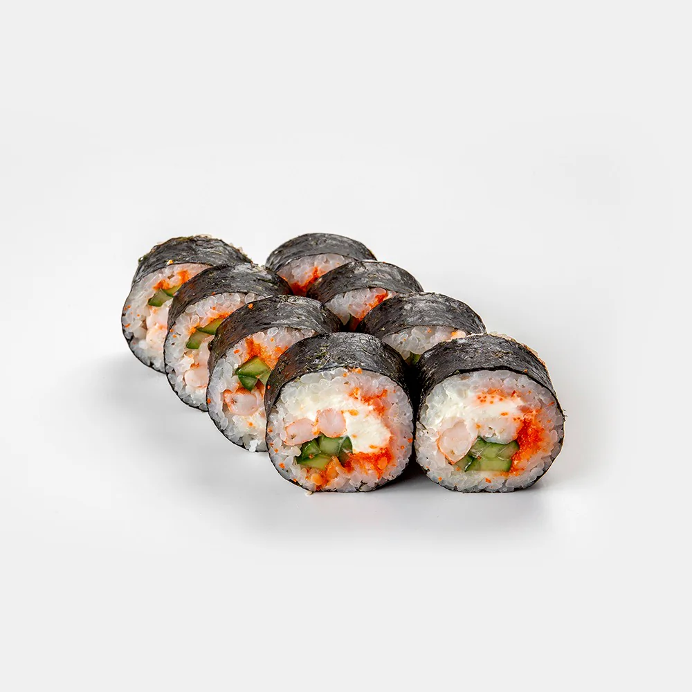 Мясо королевской креветки, тобико, дайкон маринованный, огурец, творожный сыр