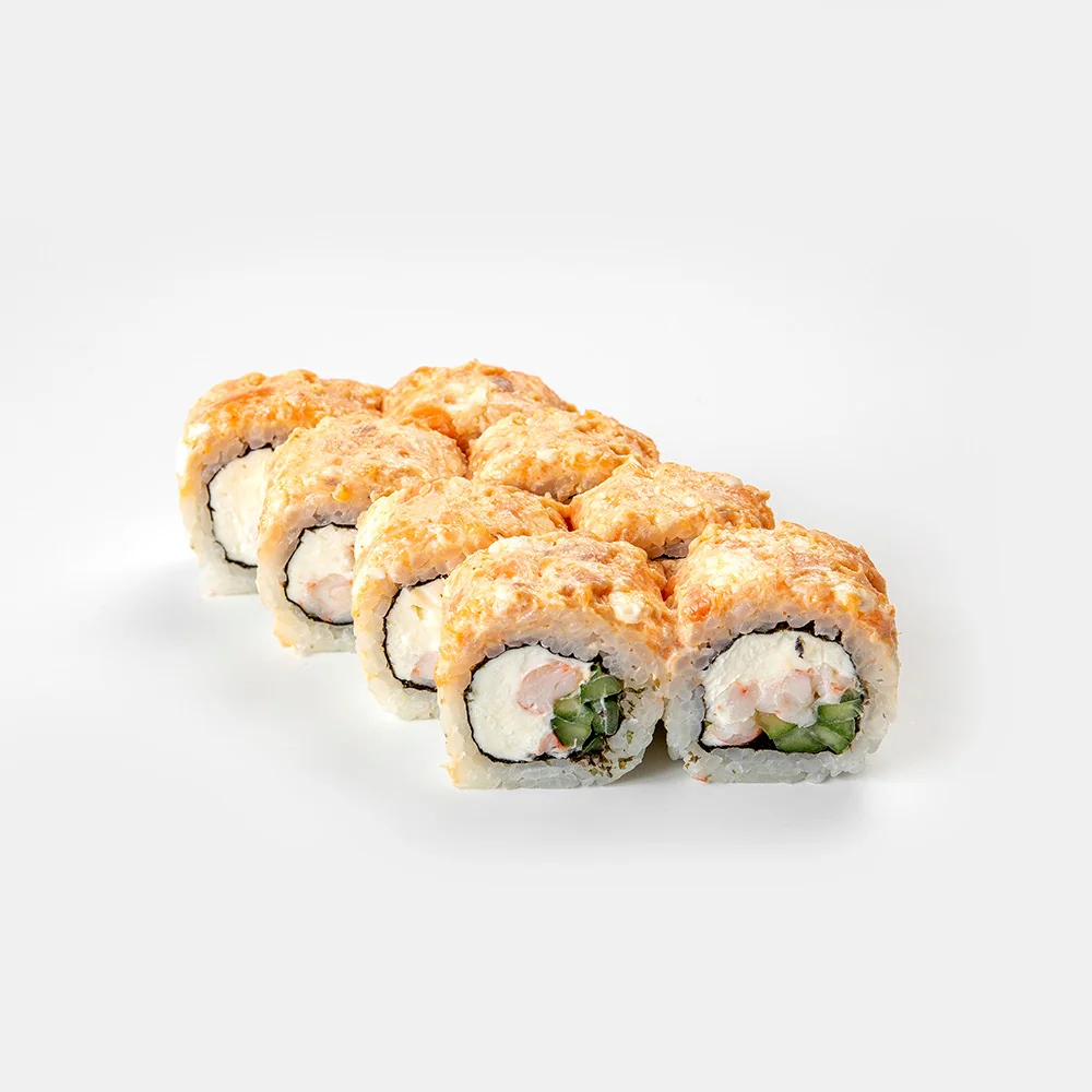 Запеченный ролл. Сливочный сыр, фирменный соус, Огурец, Креветка, Унаги, тонко нарезанный Лосось, сыр Чеддер. Состав включает в себя в том числе и шапочку ролла. Возможна небольшая острота в ролле.