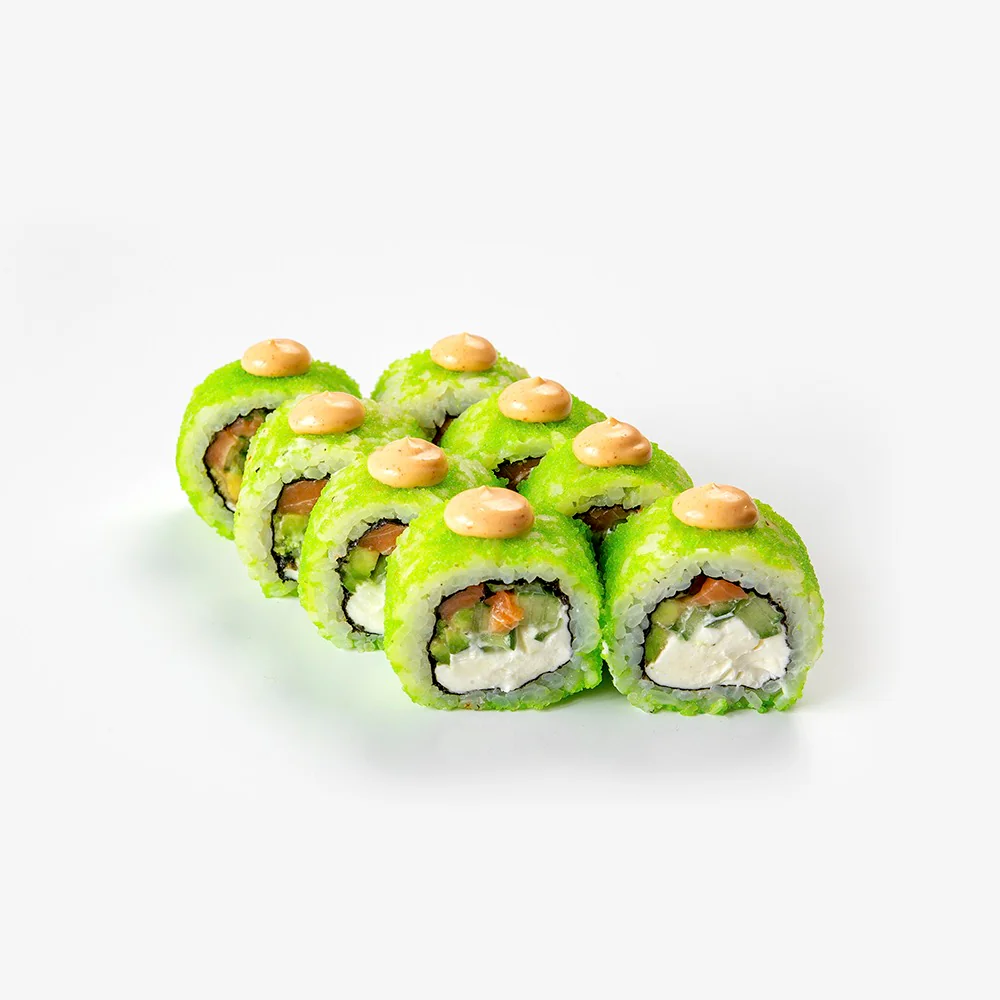 Масаго Зеленая, тонко нарезанный Лосось, Креветка, Майонез, Соус унаги, сыр Чеддер, сыр творожный «Hochland». Состав включает в себя в том числе и шапочку ролла. В ролле присутствует небольшая острота.