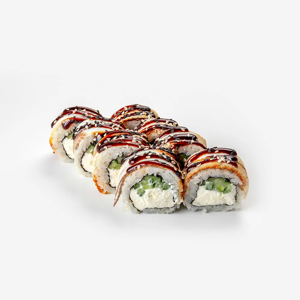 Угорь, тобико, дайкон маринованный, огурец, сливочный сыр