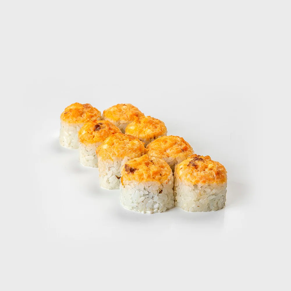 Запеченный ролл. Сыр творожный «Hochland”, Масаго Оранжевая, тонко нарезанный Лосось, Гребешок, Краб, Майонез, Соус унаги, сыр Чеддер. Состав включает в себя в том числе и шапочку ролла. В ролле присутствует небольшая острота соуса.