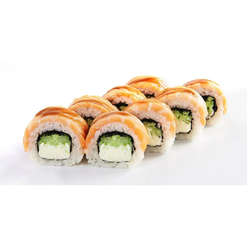 Сливочный сыр, фирменный соус, Огурец, Креветка, Унаги, тонко нарезанный Лосось, сыр Чеддер. Состав включает в себя в том числе и шапочку ролла. Возможна небольшая острота в ролле.