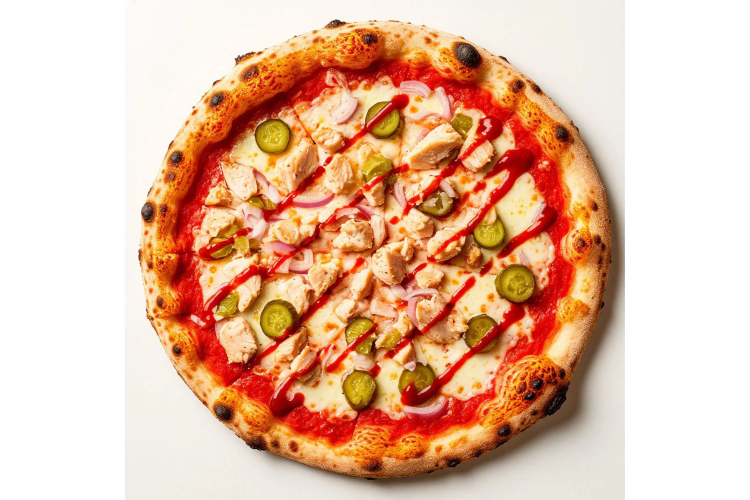 Неаполитанская пицца, Состав - куриное филе, маринованные огурцы, моцарелла, красный лук, фирменный соус горчичный. Диаметр пиццы 30 см.