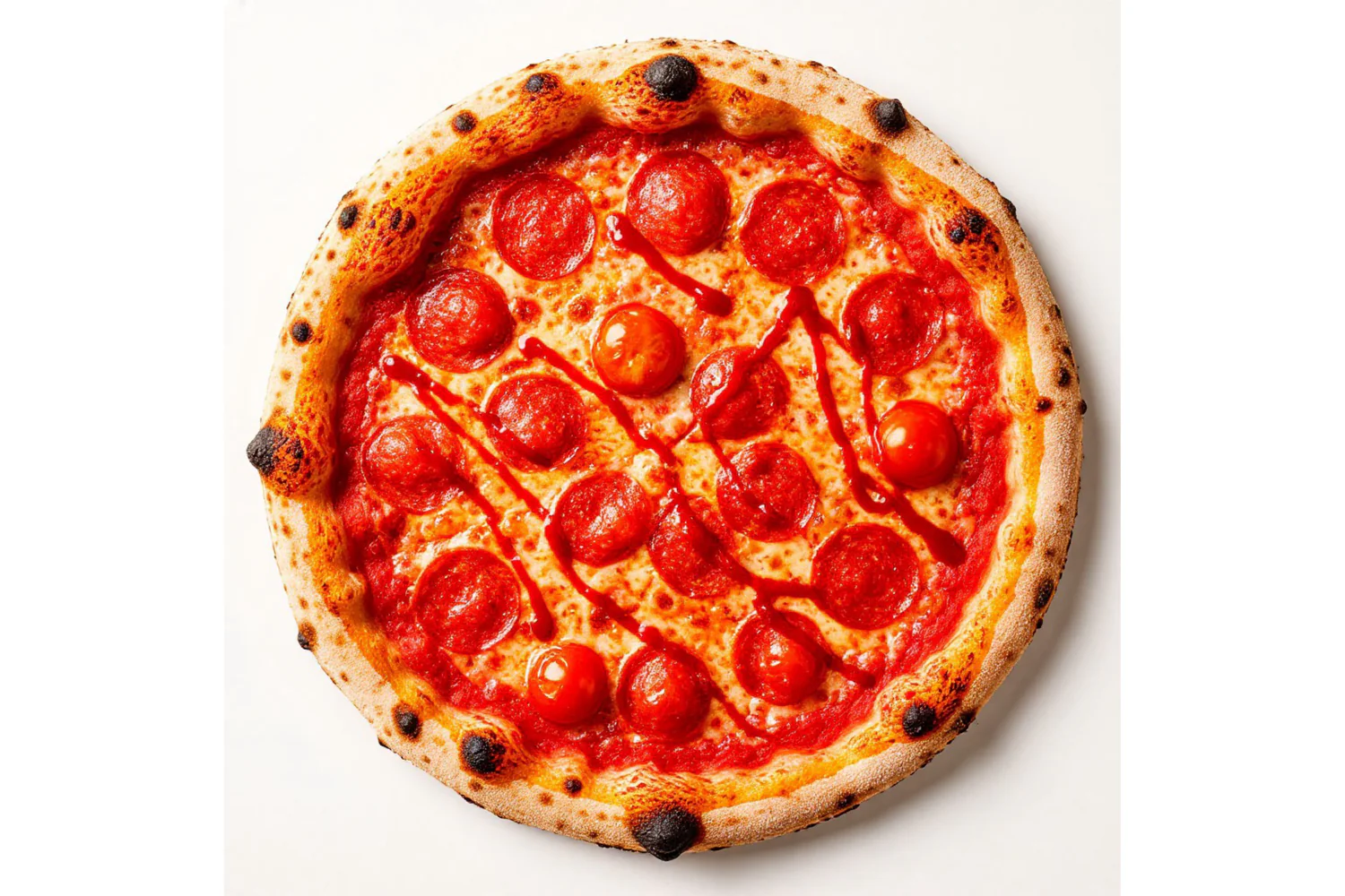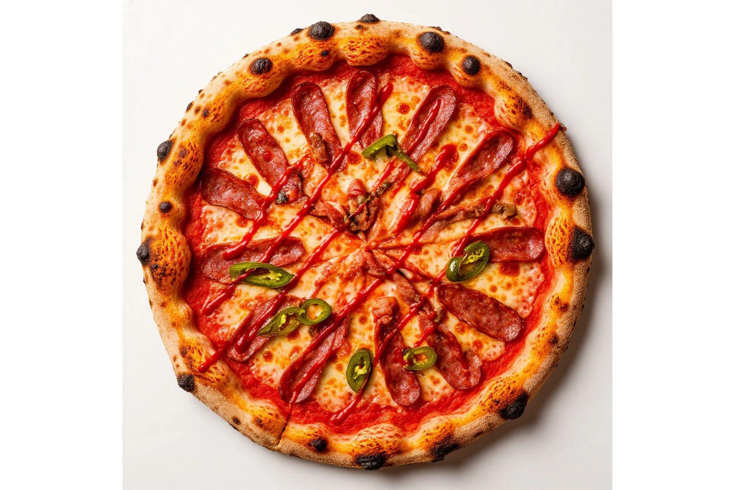 Неаполитанская пицца. Состав - Моцарела, Баварские колбаски, томаты, перец халапеньо, бекон, фирменный соус. Диаметр пиццы 30 см. Пицца острая.ж