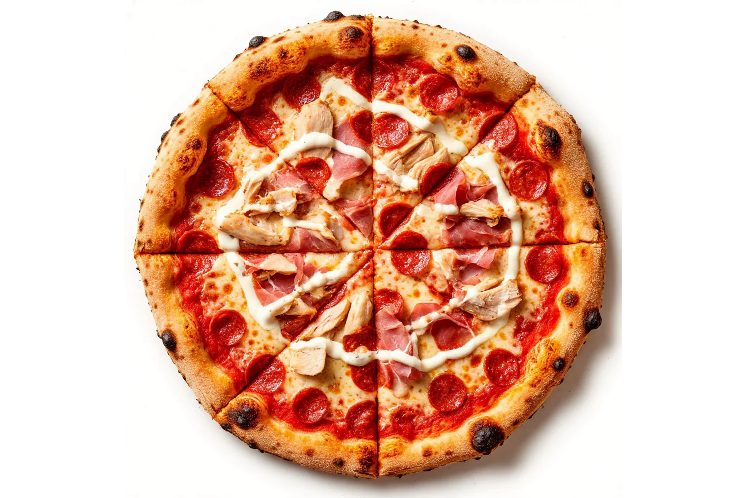 Неаполитанская пицца. Состав - моцарелла, куриное филе. Ветчина, пепперони, баварские колбаски, фирменный соус. Диаметр пиццы - 30 см.