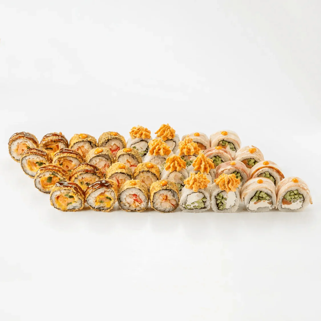 Цезарь, дракон, гесенай, акинава, классический ролл с копченой курицей, классический ролл с тунцом, классический ролл с огурцом, классический ролл с лососем. роллов - 8 кусочков - 56 шт.