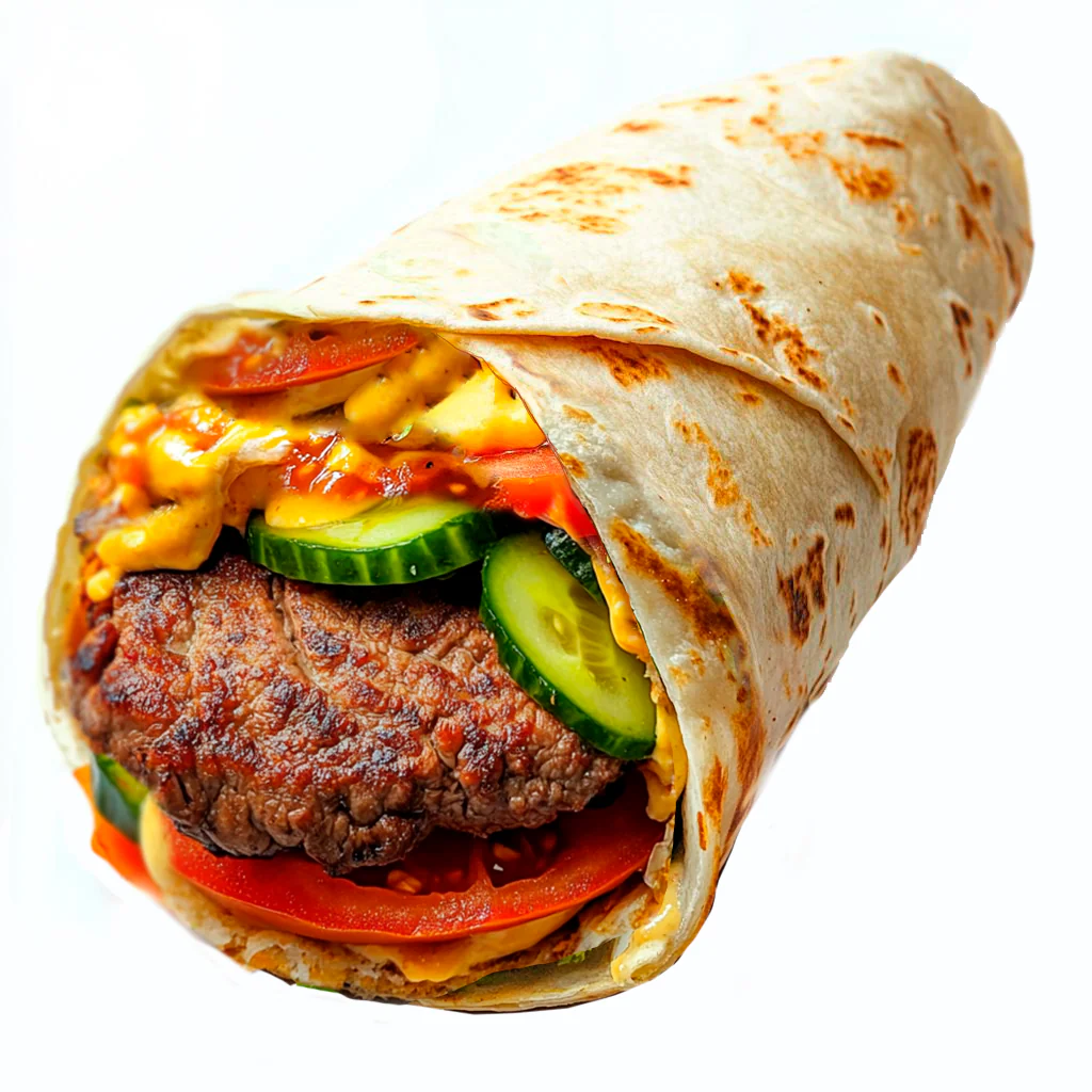 Обжаренная куриная котлета, ломтик помидора и зрелый сыр в пресной пшеничной лепешке, заправленной специальным соусом